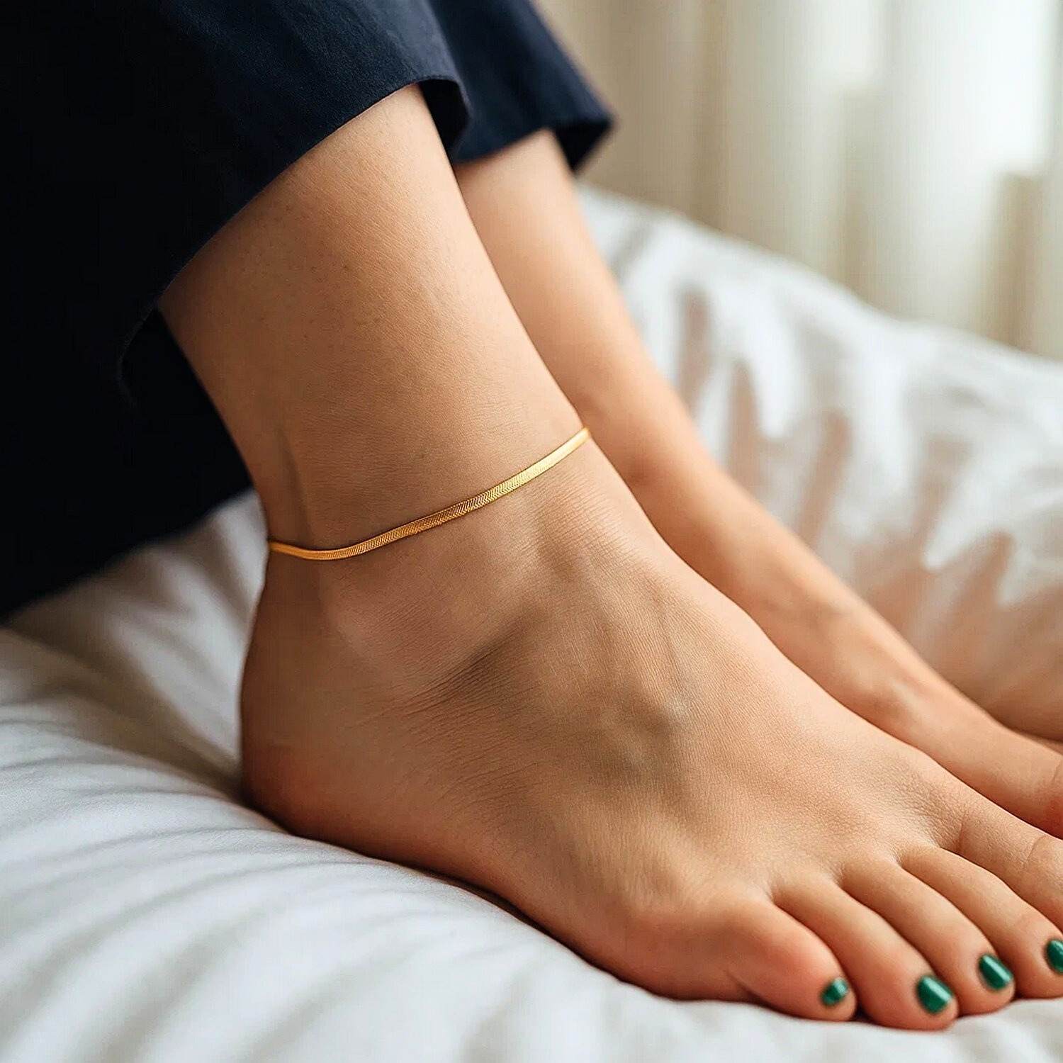 Real 14K Yellow Gold Herringbone Ankle Bracelet offers an elegant sparkle with its simple yet impressive design. It is an excellent choice for everyday chic or as a special gift. Order online now and don’t miss out on free shipping and special discount opportunities.