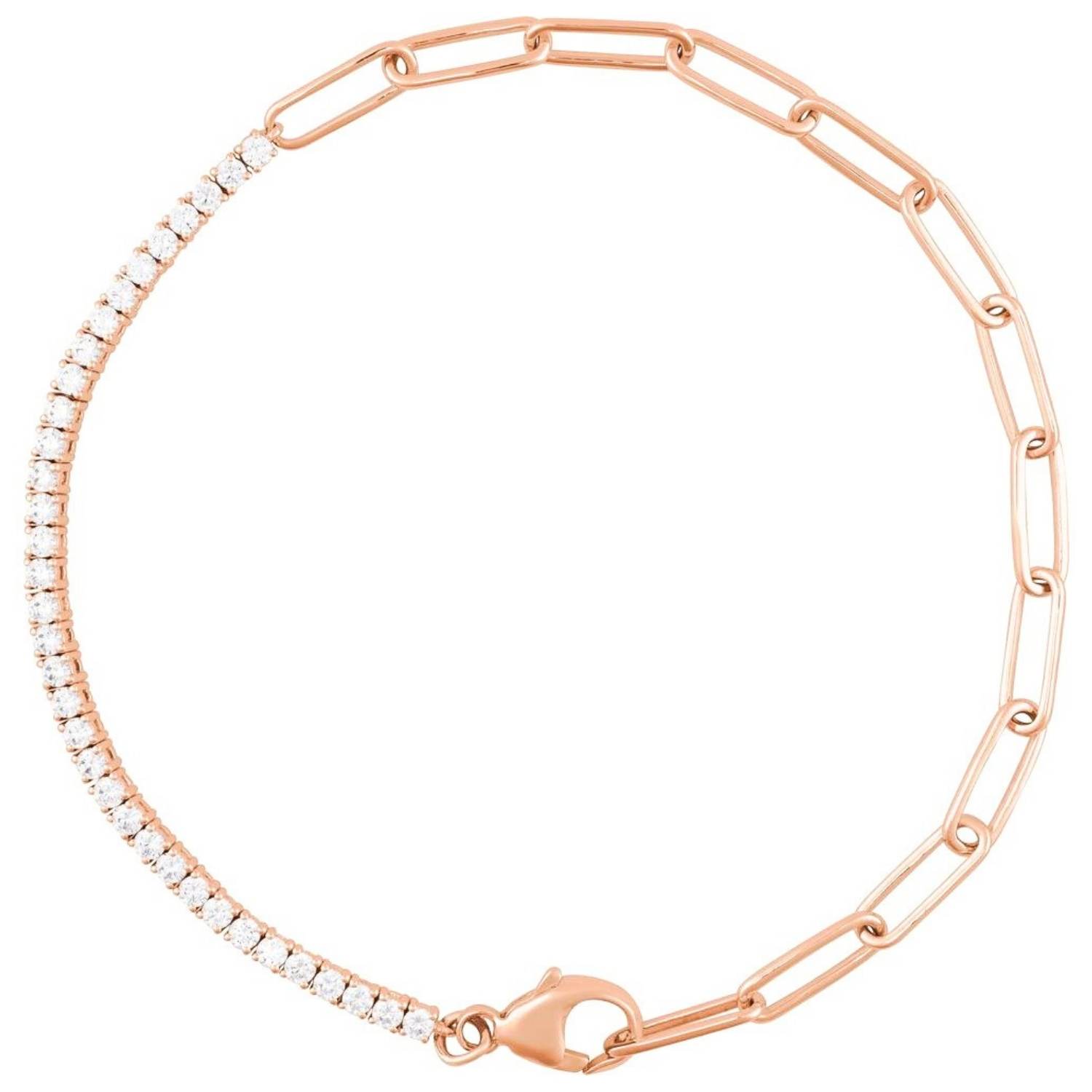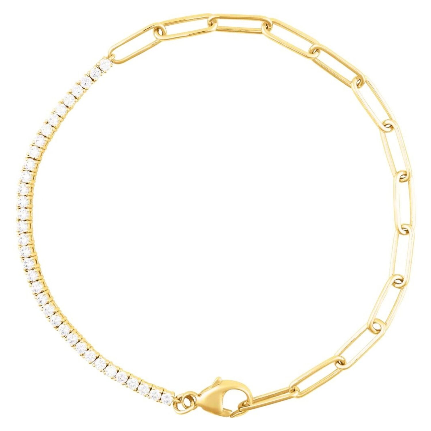 This 1 CTW Diamond Half Paperclip Half Tennis Bracelet combines the modern lines of a paperclip chain with the sparkle of a classic tennis bracelet. Natural round diamonds totaling 1 CTW (≈1.9 mm) are set in a row on one half of the chain; the other half is designed in a paperclip chain form. It offers a piece that stands out in both everyday styles and special occasion outfits.
