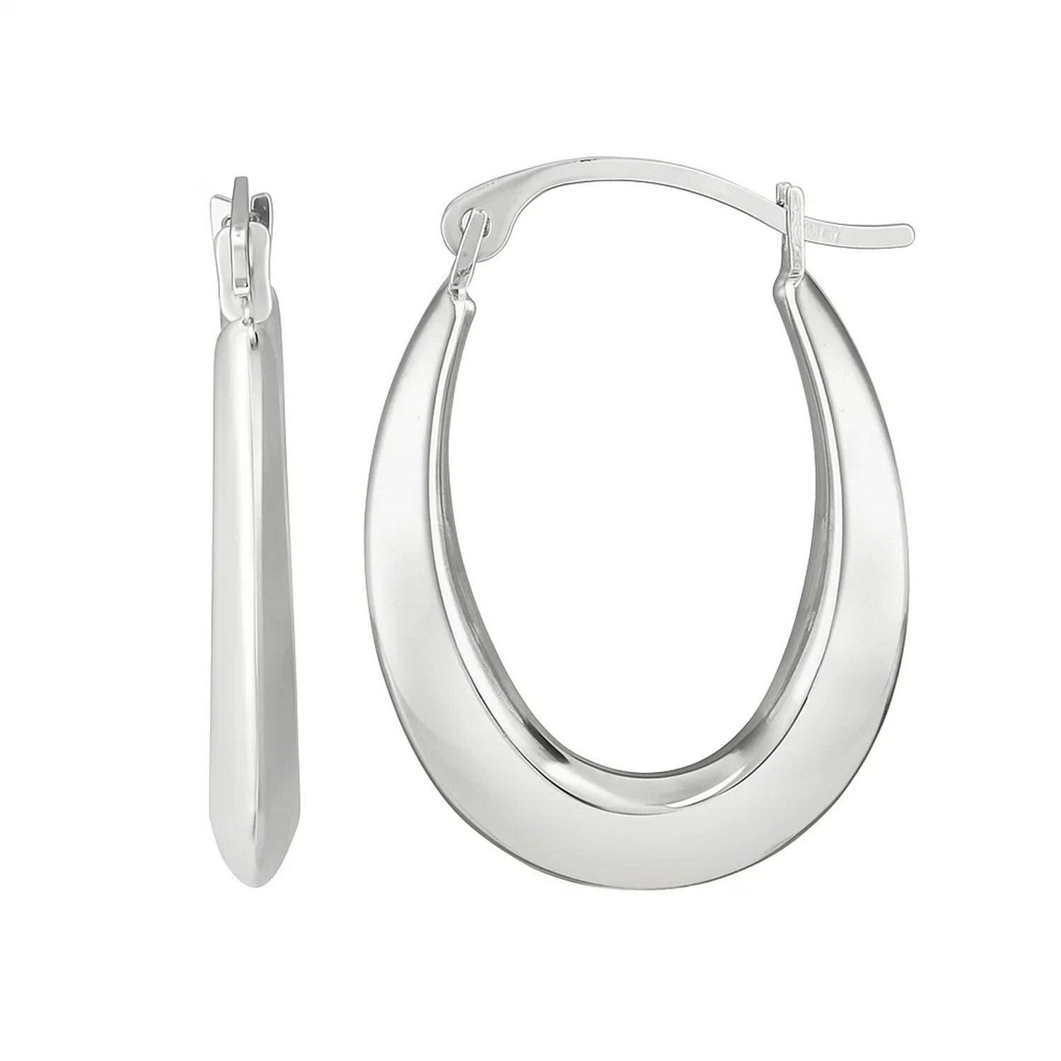 Elegant 10K white gold graduated oval lightweight hoop earrings featuring a polished finish and smoothly tapered design. The graceful oval shape adds depth and dimension, creating a refined look that’s perfect for everyday elegance or special occasions.