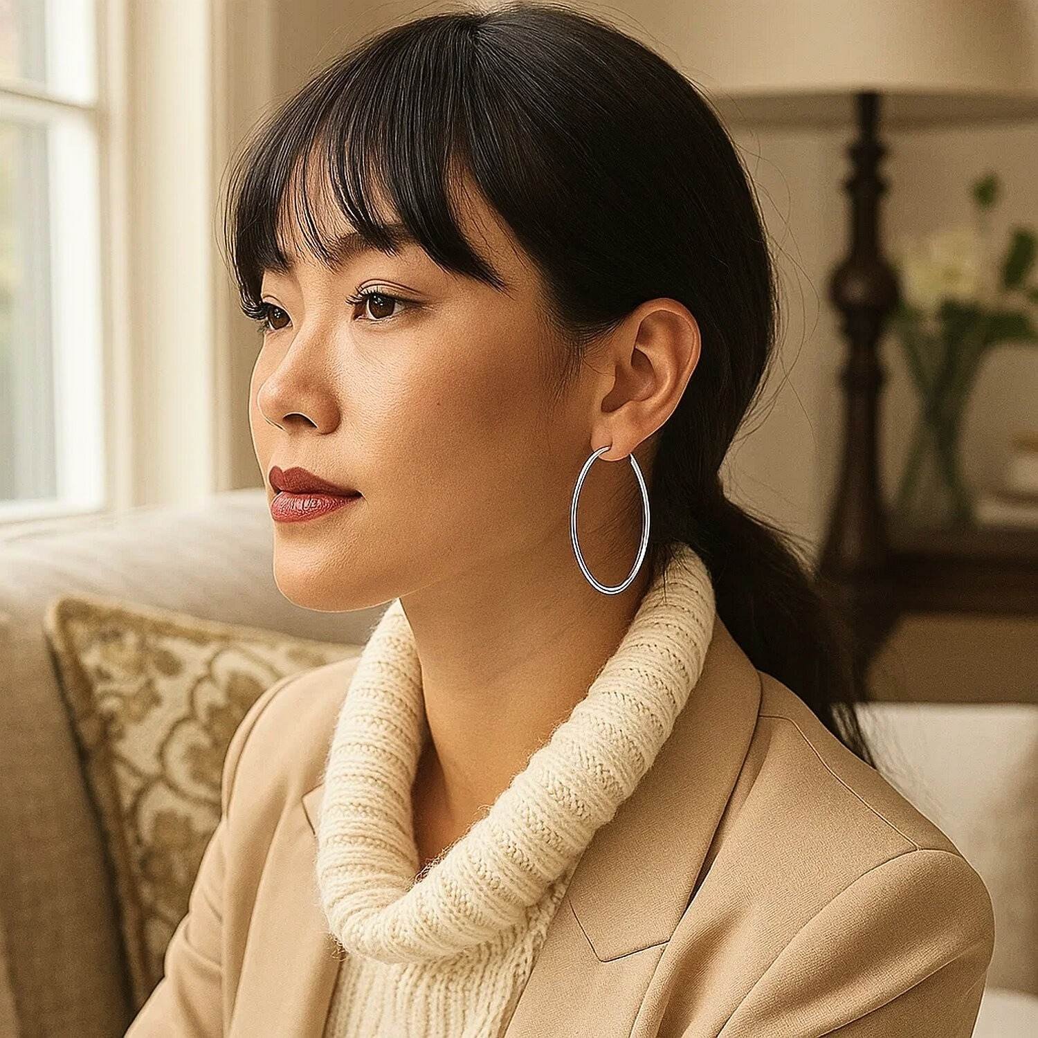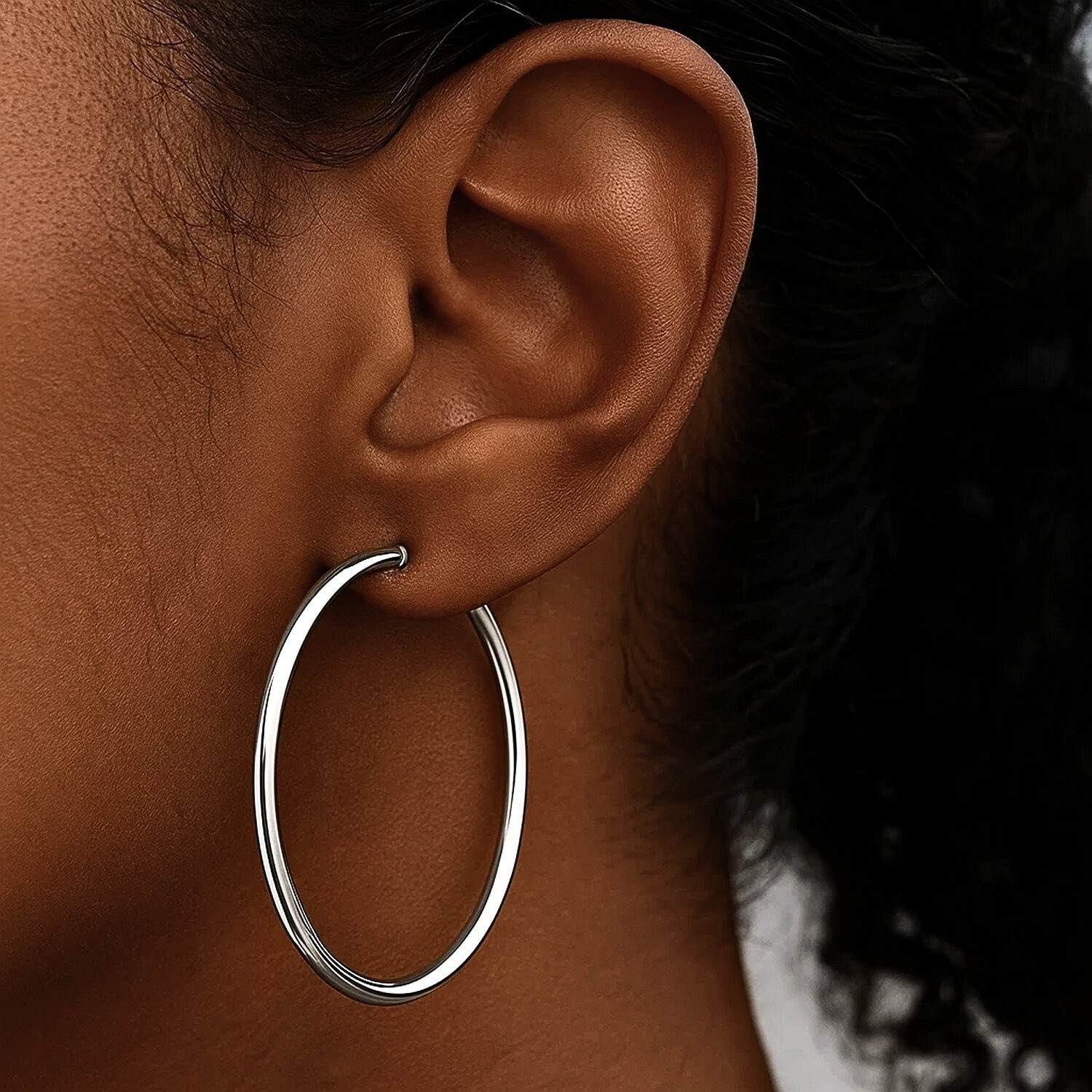The 10K White Gold Large 50mm Thin Hoop Earrings are an elegant piece of jewelry that stands out for its simplicity. They offer comfort for everyday wear and elegance for special occasions. Order online now and don’t miss out on free shipping and special discount opportunities.hem yours today.