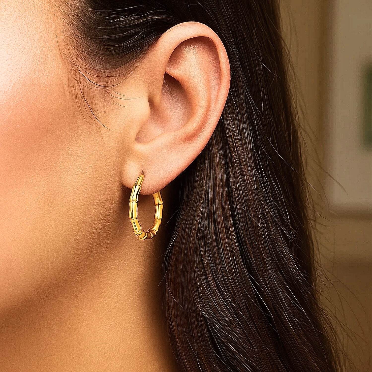 Real 10K Yellow Gold Bamboo Hoop Earrings for Women