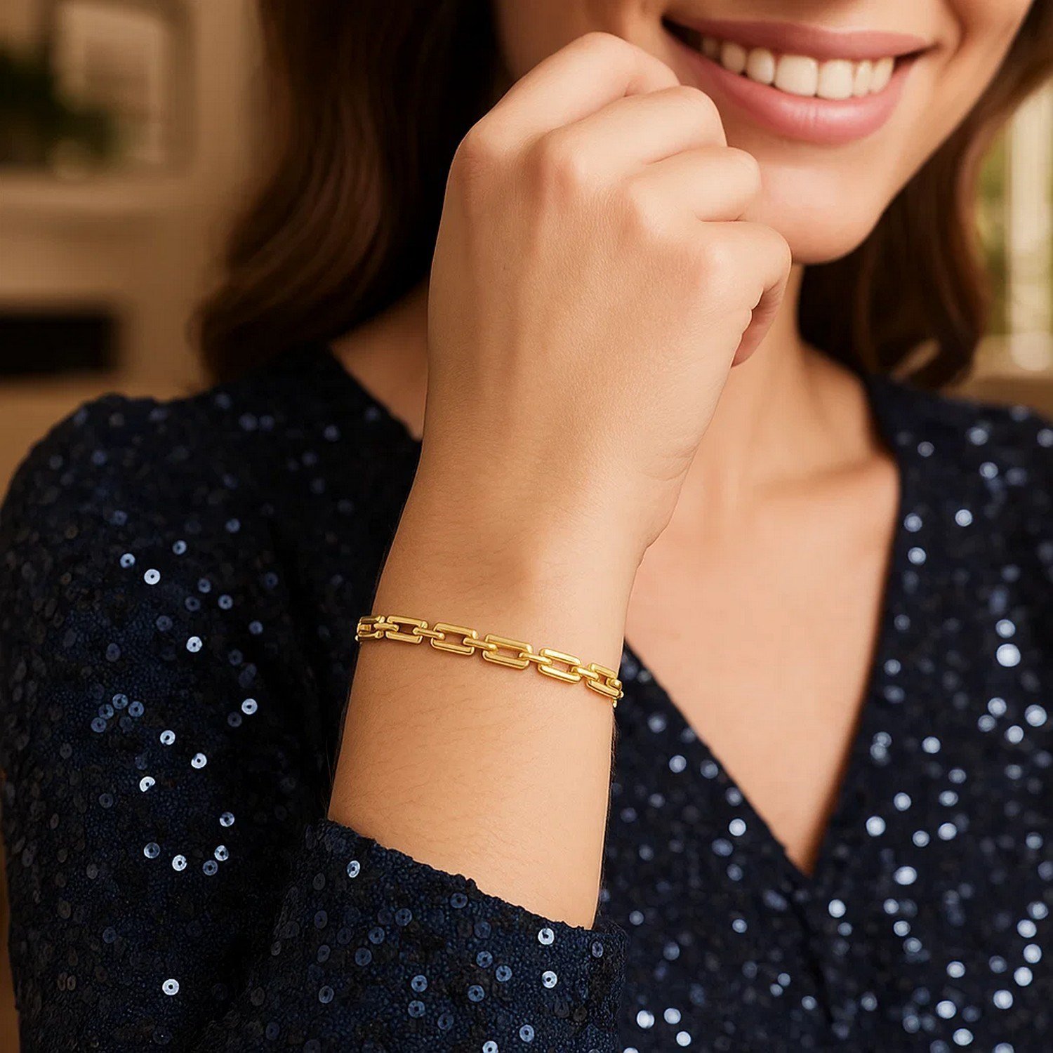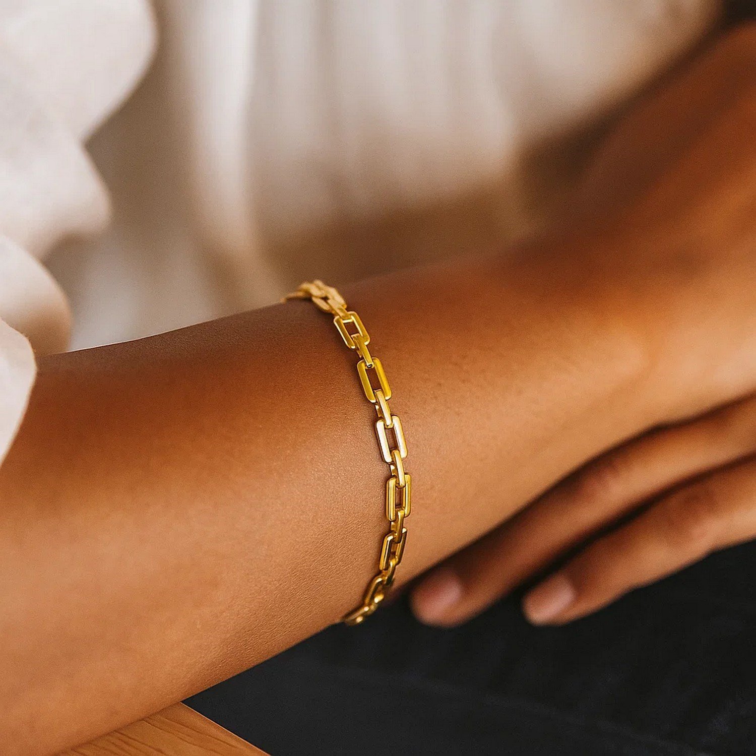The 10K Yellow Gold Art Deco Rectangle Link Bracelet is crafted with fine jewelry quality, offering a simple and elegant bracelet with geometric rectangular links. Its shiny gold surface retains its original appearance for a long time and does not tarnish. Its hypoallergenic composition makes it safe for sensitive skin. Its lightweight design ensures comfortable all-day wear. The Art Deco-inspired link design adds both vintage and modern elegance to the bracelet. It is a unique piece of jewelry that can be given as a luxurious and stylish gift for Valentine’s Day, birthdays, or other special occasions.