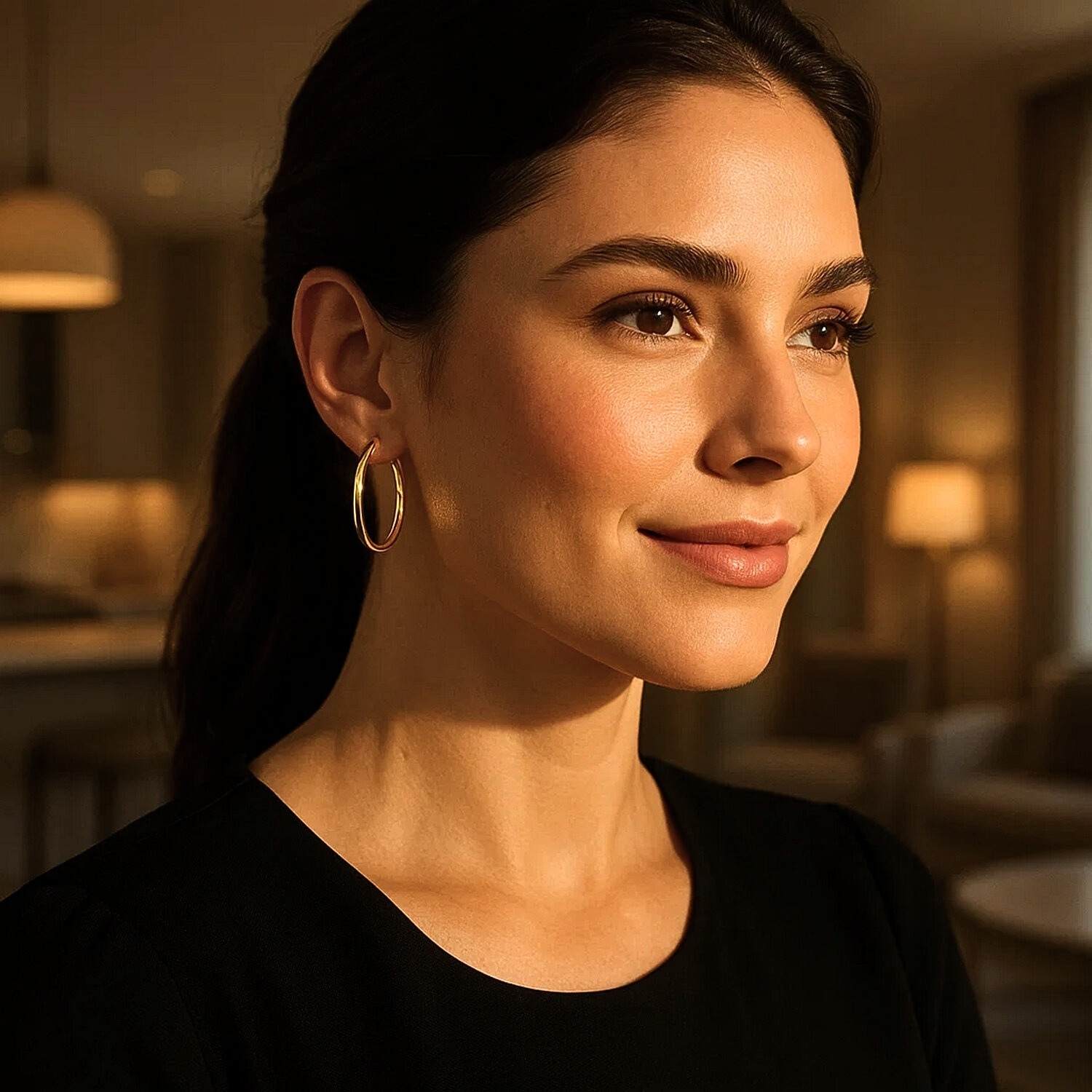 Measuring 25 mm in diameter and 3 mm in width (0.98 × 0.12 inches), these earrings offer all-day comfort with their lightweight construction of approximately 1.6 grams. The snap lock system ensures secure wear, keeping them in place even when you’re on the move. The solid gold construction provides long-lasting shine and durability, making them an essential part of your jewelry collection.