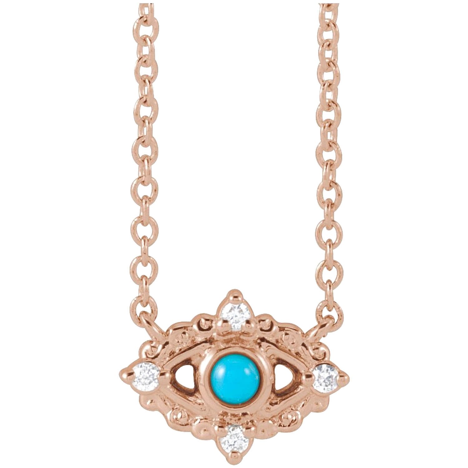 This Diamond and Turquoise evil eye necklace features a clean and balanced design centered around a round natural turquoise stone, accented with natural diamonds for subtle sparkle. The classic evil eye motif is incorporated in a minimal form, allowing the design to remain refined and easy to wear.