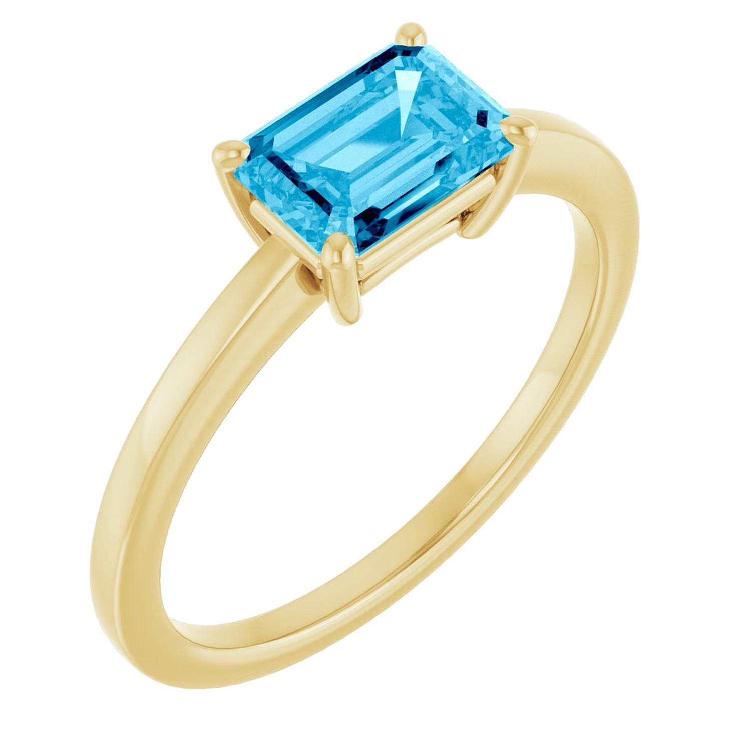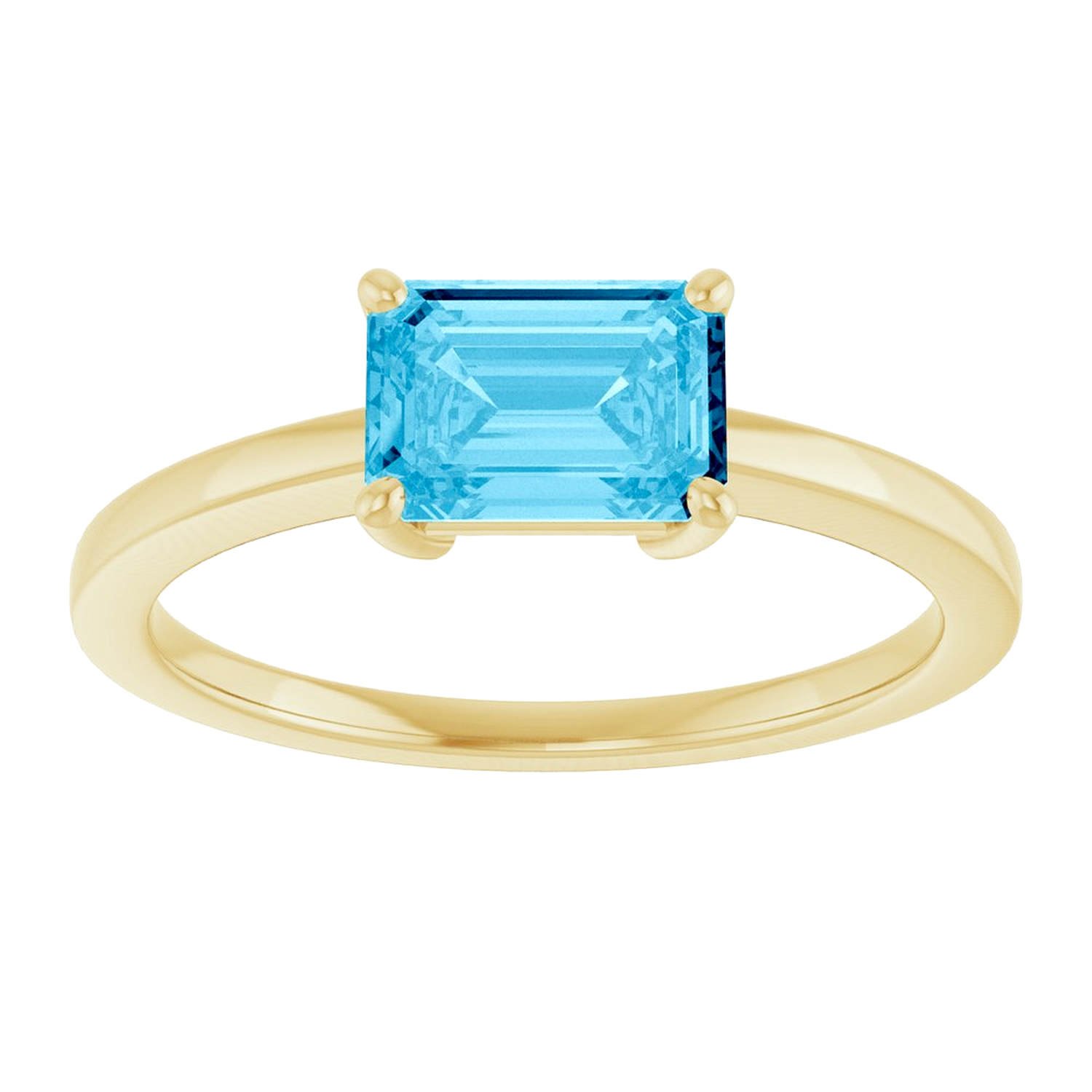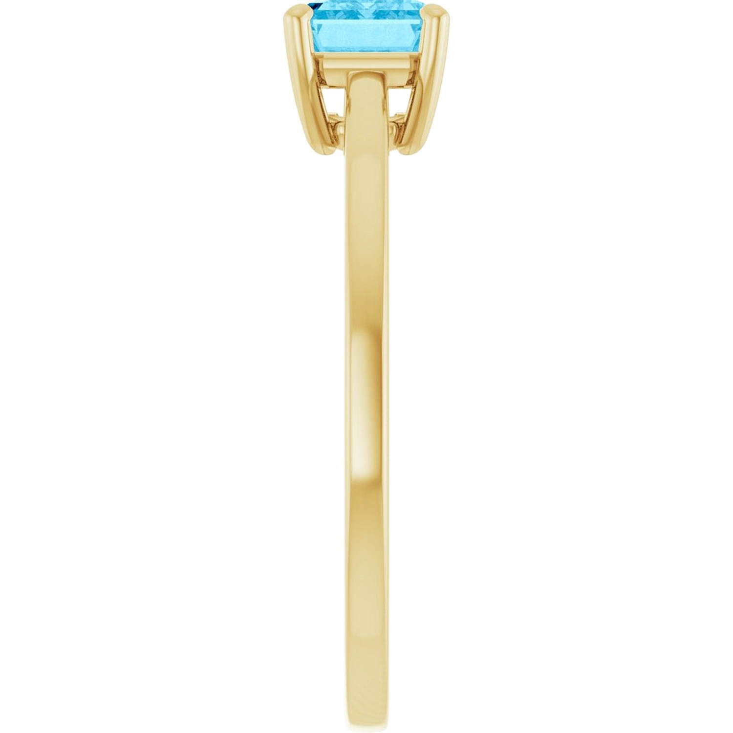 Set in solid 14k gold, the emerald-cut aquamarine is secured with a classic four-prong setting that allows light to enter the stone while maintaining a stable and wearable structure. The slim shank and polished finish keep the design understated, letting the stone remain the focal point.