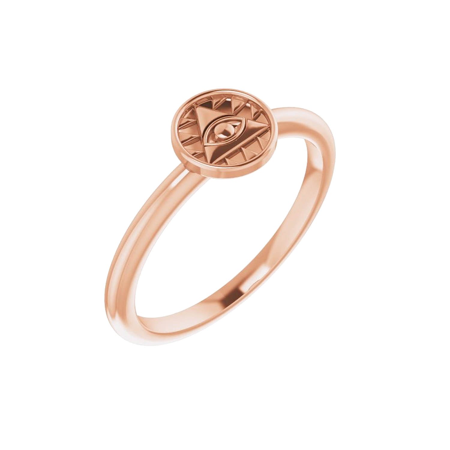 Crafted with fine jewelry quality, the 14K Gold Stackable Eye of Providence Ring features the central Eye of Providence symbol. The eye figure within the triangle is designed surrounded by rays, symbolizing divine protection and guidance for humanity. Its minimalist and elegant design allows it to be worn alone or combined with other stackable rings for a stylish look.