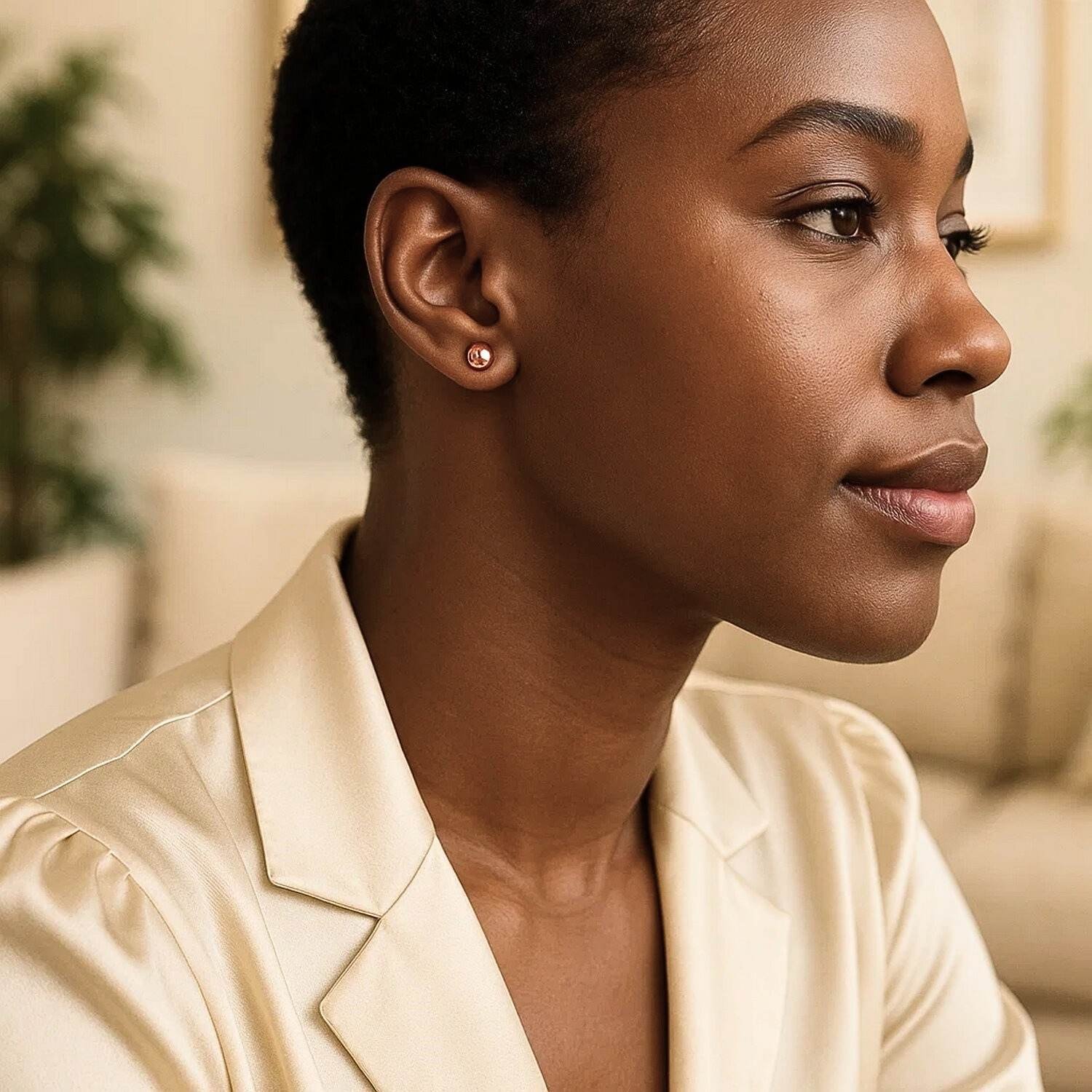 14K Rose Gold Ball Stud Earrings add an elegant touch to any style with their simple form and warm rose gold tone. The classic 4 mm sphere design offers a timeless look that can be worn comfortably with both everyday outfits and on special occasions. The polished surface naturally reflects light, giving the ear a soft glow.