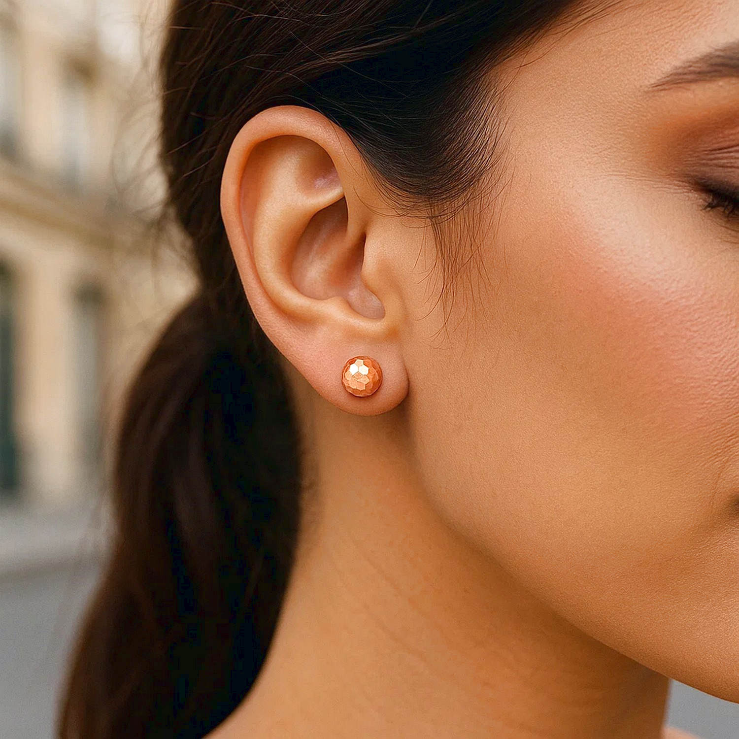 Faceted Surface 14K Rose Gold Faceted Ball Stud Earrings 7mm offer a warm and feminine look with their elegant rose gold tone. The faceted surface reflects light from every angle, creating a natural sparkle. Thanks to its genuine 14K rose gold construction, it does not tarnish, is nickel-free, and hypoallergenic. It provides simple elegance for everyday wear and stands out as an elegant accessory for special occasions.
