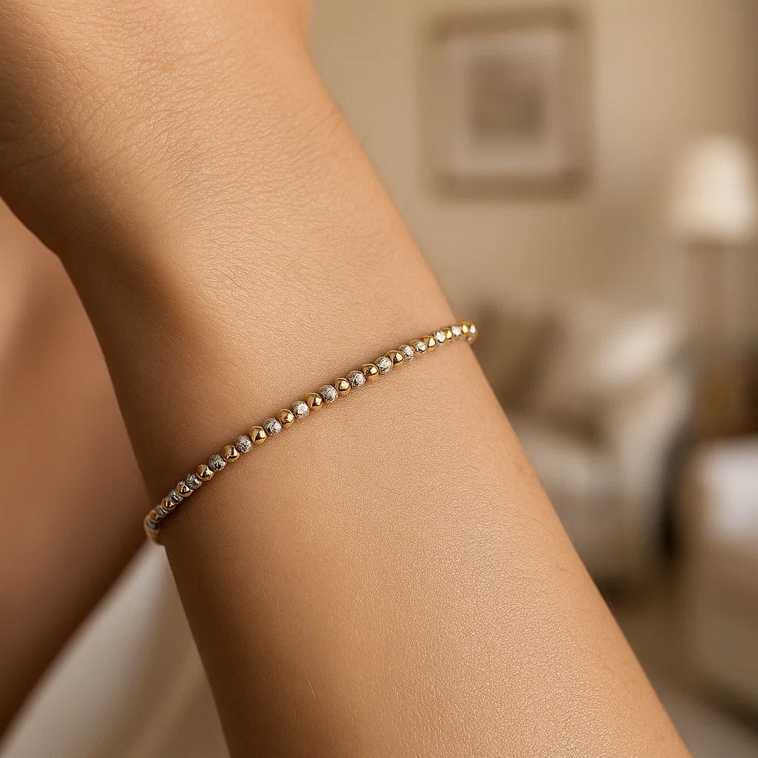 The 2mm 14K Two-Tone Gold Pallina Bead Bracelet offers an elegant shine with its polished beads. Its modern two-tone gold design makes it suitable for everyday wear, and its lightweight construction ensures a comfortable fit on the wrist. Designed with fine jewelry quality, this bracelet completes your style when worn alone or combined with other bracelets. It is tarnish-resistant and hypoallergenic for safe use.