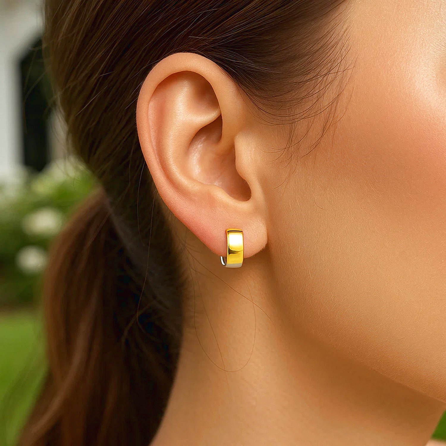 Small Thick 14K Two-Tone Gold Reversible Hoop Earrings 16mm are an elegant and functional design that combines two different looks in one piece. Designed with the harmony of yellow and white gold, these earrings offer elegance in both classic and modern combinations with their reversible design. Thanks to their genuine 14K two-tone gold construction, they do not tarnish and are hypoallergenic. They feature a comfortable form that can be worn comfortably all day long.