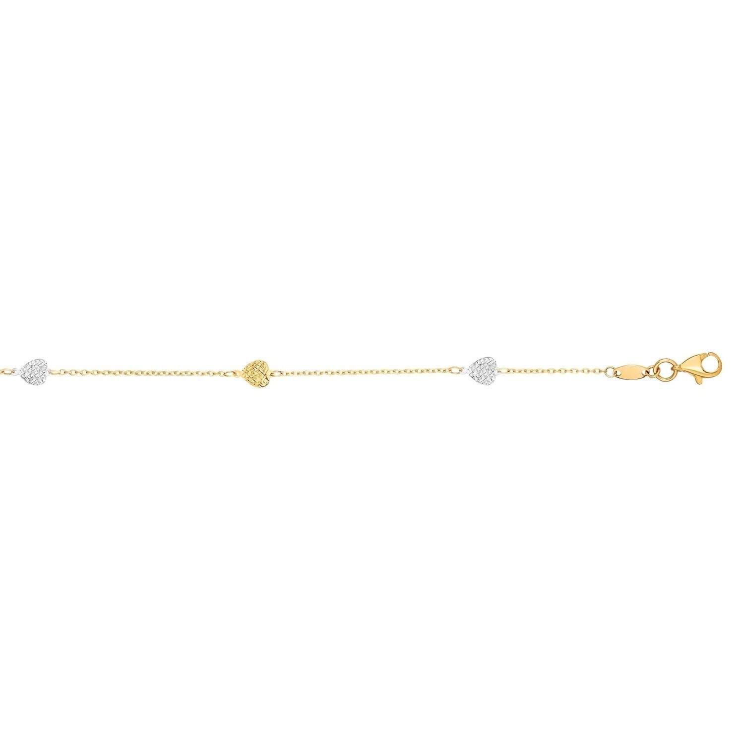 Real 14K Two-Tone Heart Anklet is a hypoallergenic model crafted with fine jewelry quality and handcrafted workmanship that will not tarnish. The textured heart details combining yellow and white gold offer an elegant and modern look on the wrist. It is a unique and eye-catching design that stands out as a stylish accessory for everyday use and a sophisticated accessory for special occasions.
