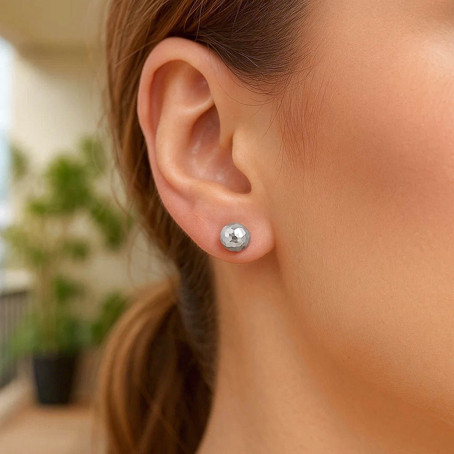 14K White Gold Faceted Textured 5mm Ball Stud Earrings feature a surface finish that adds a modern twist to the classic ball stud design. The faceted texture reflects light from different angles, creating an elegant sparkle. Thanks to their genuine 14K white gold construction, they are tarnish-resistant, nickel-free, and hypoallergenic. They offer simple elegance for everyday wear and a sophisticated finishing touch for special occasions.