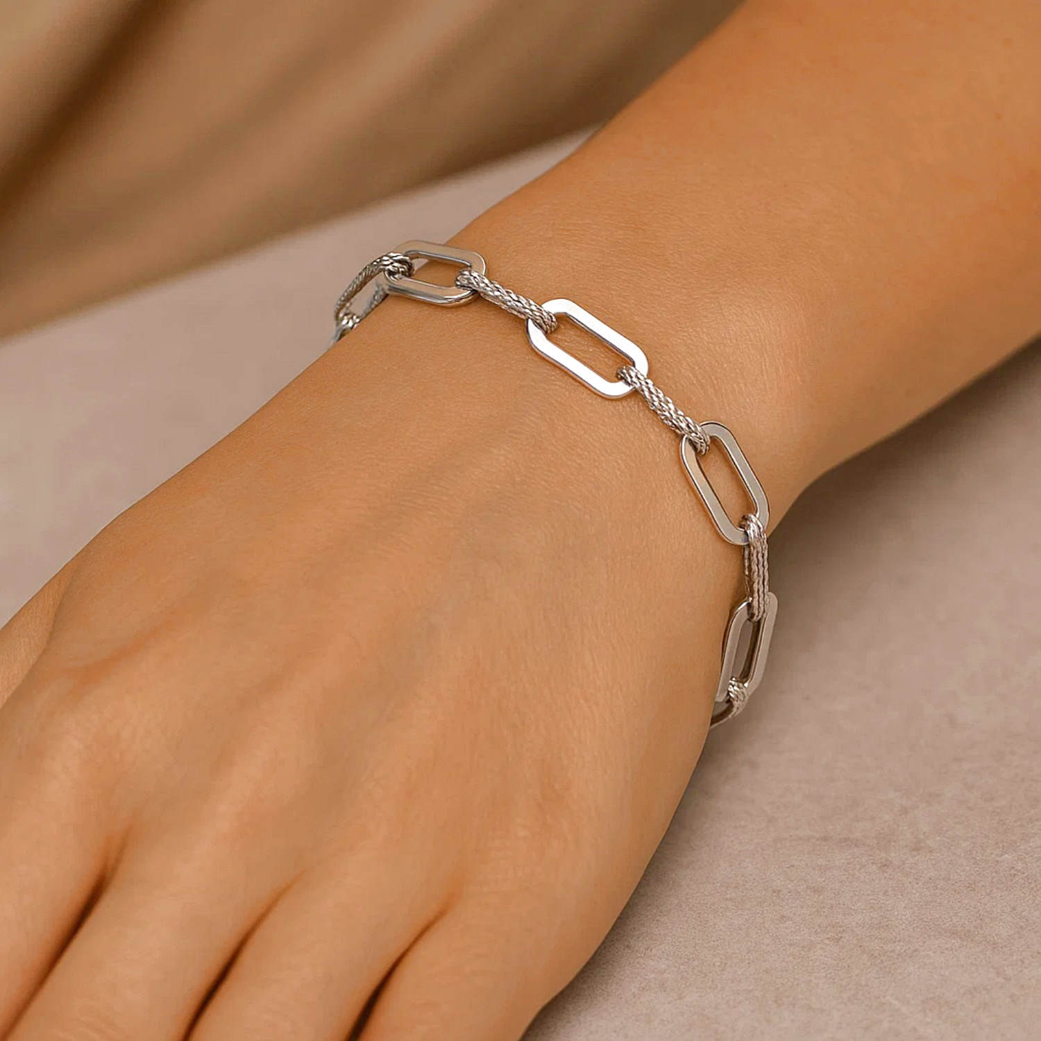 The 14K White Gold Paperclip Bracelet, with its modern paperclip link design and diamante (light-reflecting cut) surface, is a stylish bracelet suitable for everyday wear for both women and men. Crafted from 14K white gold, this delicate piece of jewelry is durable, tarnish-resistant, and retains its shine for a long time. Its smooth texture ensures comfortable wear on the wrist. It provides a clean and bold look on its own, but can also be combined with other bracelets and layered to create a more assertive style.