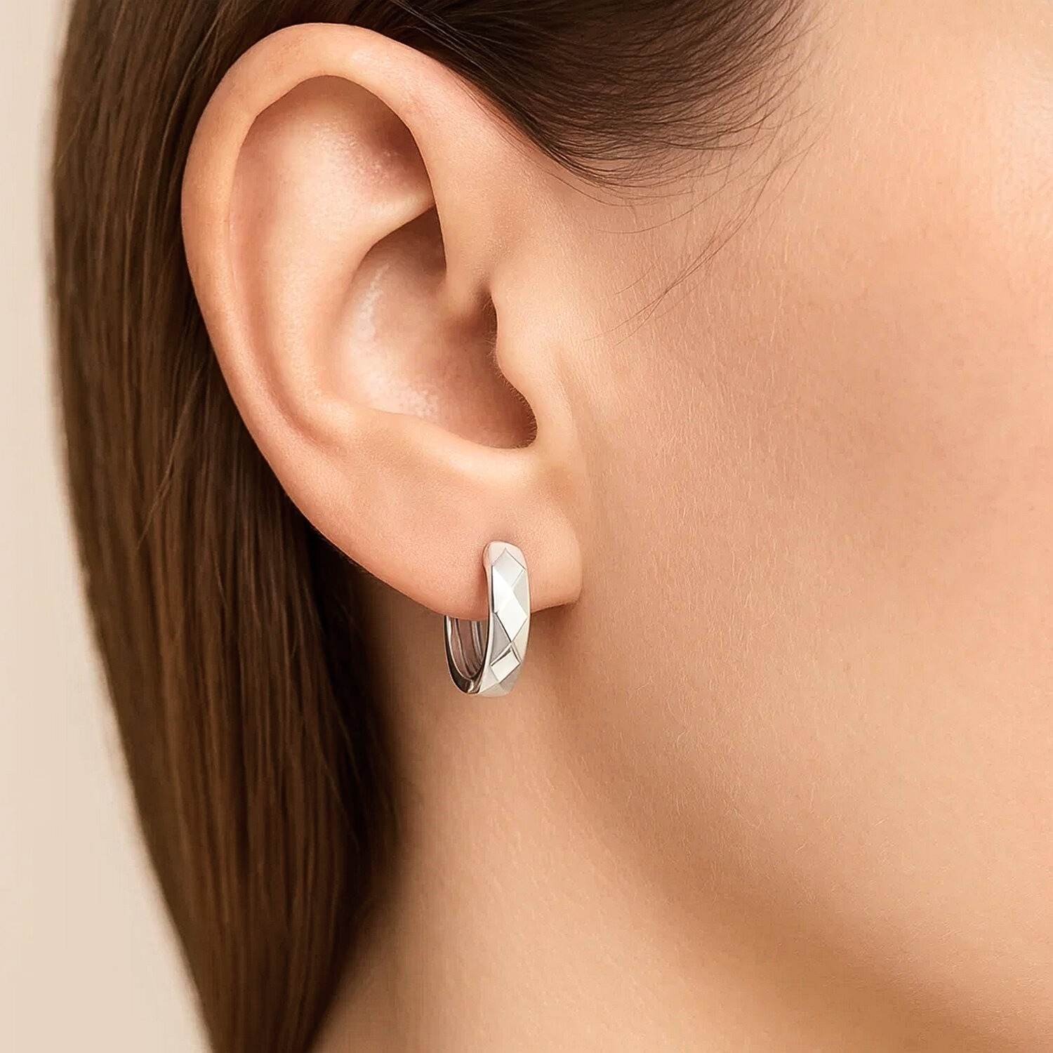 Crafted from 14K white gold, these Faceted Diamond Motif Huggie Hoop earrings combine classic elegance with a modern twist. The diamond-shaped surface details reflect light from every angle, creating a sparkling appearance. They do not tarnish, are hypoallergenic, and nickel-free. Their lightweight construction makes them comfortable for everyday wear, while their fine jewelry-quality craftsmanship ensures they are a long-lasting piece.