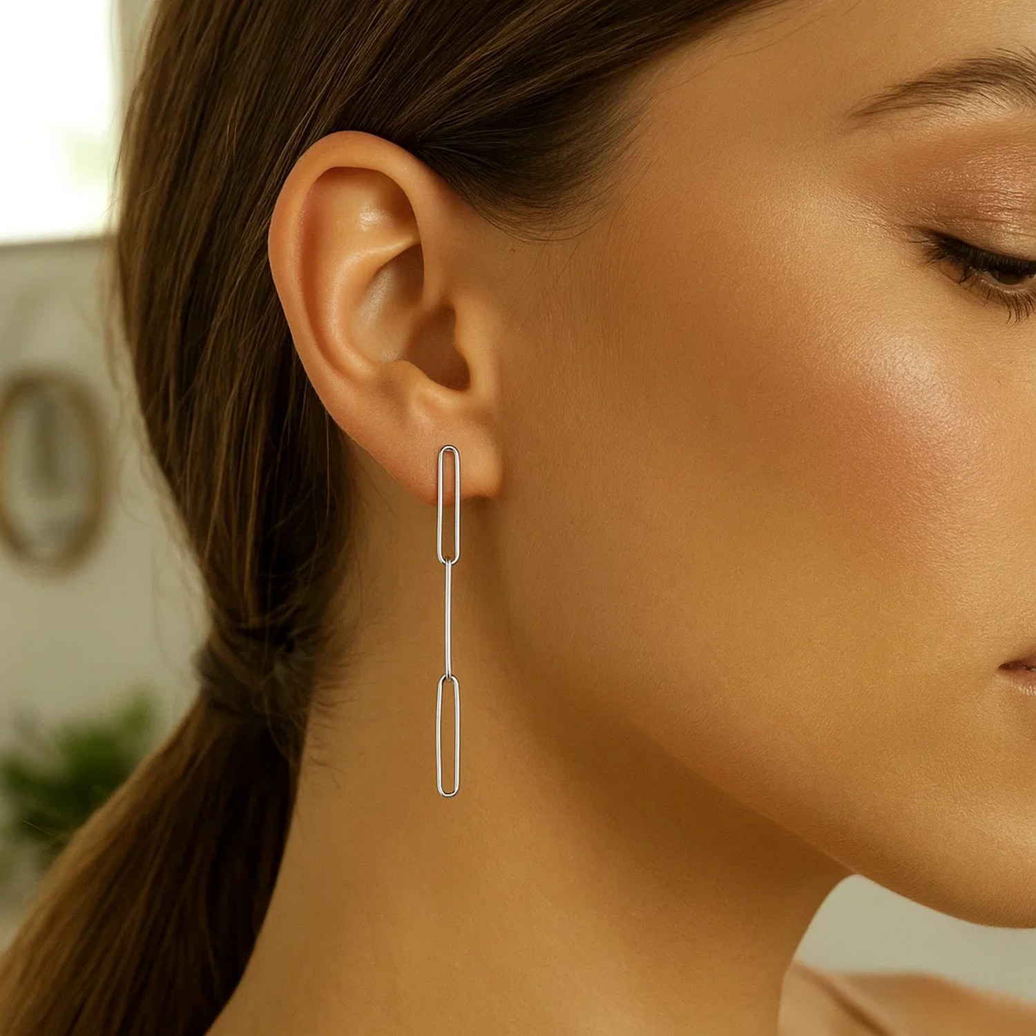 Contemporary 14K white gold Lungo paperclip drop earrings featuring elongated polished links for a sleek, modern look. Lightweight and elegant, these statement drops offer timeless sophistication perfect for both everyday wear and special occasions.
