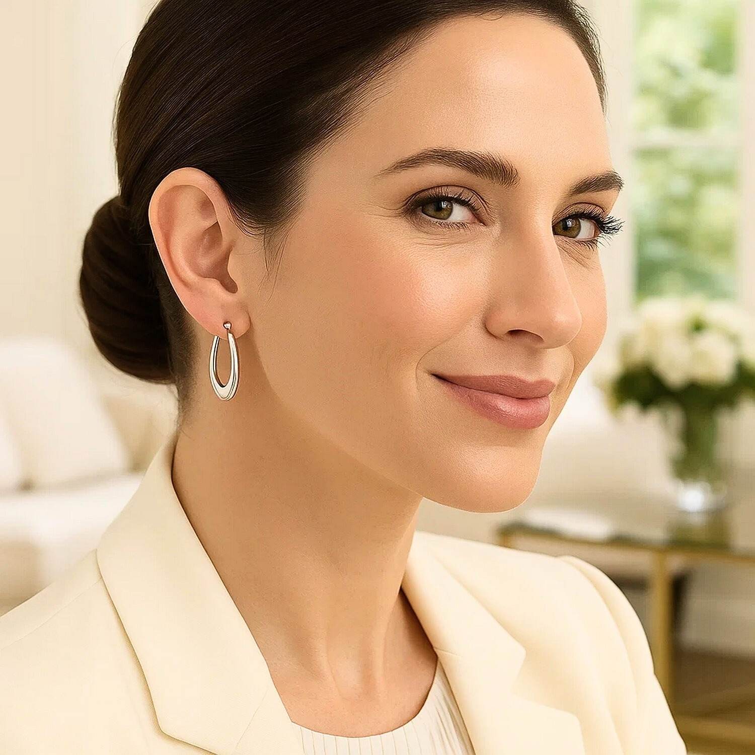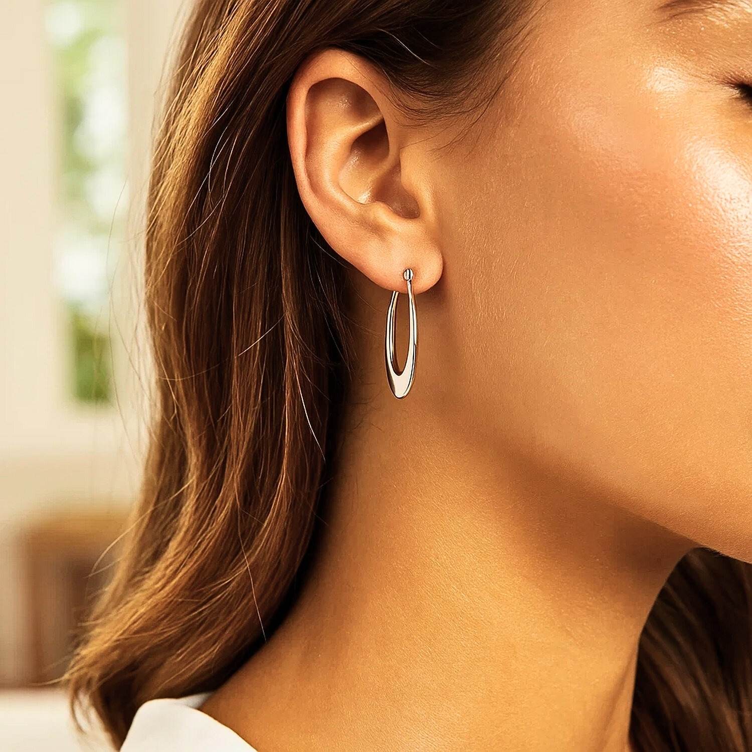 The 14K White Gold Graduated Flat Oval Hoop Earrings stand out with their elegant design, perfectly reflecting light thanks to their flat surface and graduated shape. The delicate oval lines offer a modern look, while the brilliance of 14K white gold easily complements any style.