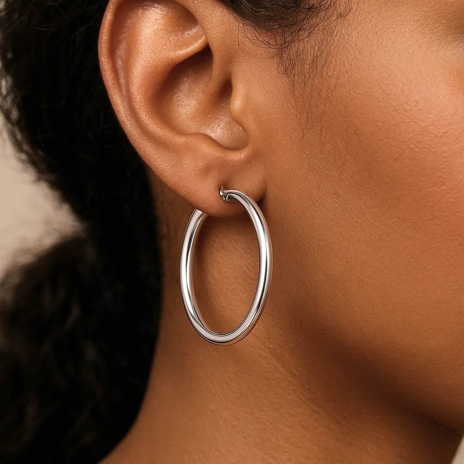 The elegant and balanced design of the 14K White Gold 4mm x 40mm Hoop Earrings makes them a must-have piece for any jewelry collection. With a thickness of 4 mm, they offer a full look, while their 40 mm diameter provides a delicate balance suitable for everyday wear.