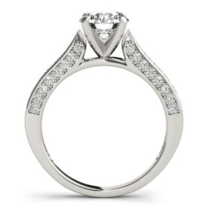 This 14 k white gold solitaire cathedral engagement ring is designed to celebrate a special commitment with timeless elegance. Its classic round diamond centerpiece captures attention with brilliant sparkle.