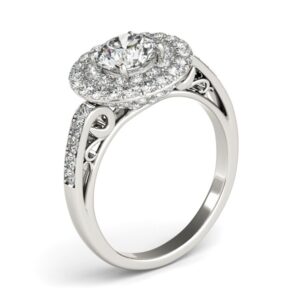 - Halo style featuring a 0.98 carat center diamond surrounded by 32 side diamonds totaling 0.31 carats