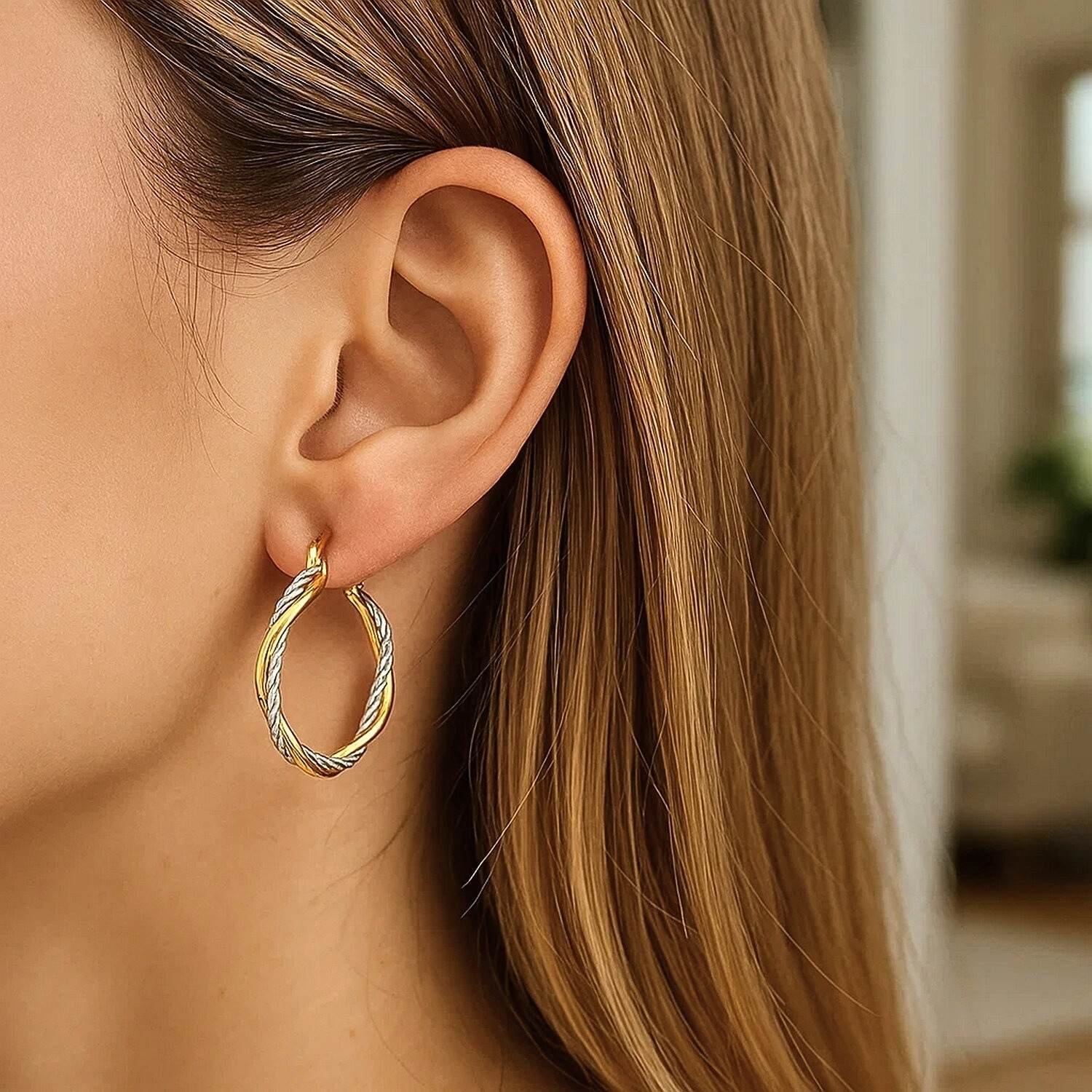 14K Two-Tone Gold Polished & Twisted Double Hoop Earrings combine the harmony of two colors with the power of elegance. Adding a warm glow to any outfit, their secure clasp ensures all-day comfort. Order online now and don’t miss out on free shipping and special discounts.