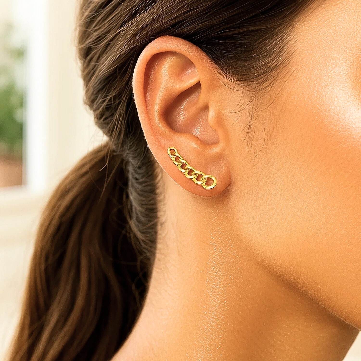 14K Yellow Gold Chain Ear Climbers add a modern touch to any style with their elegant chain design and genuine gold shine. They serve as a minimal detail for everyday outfits and a striking accessory for special occasions. Buy online now to enjoy free shipping and exclusive discounts.