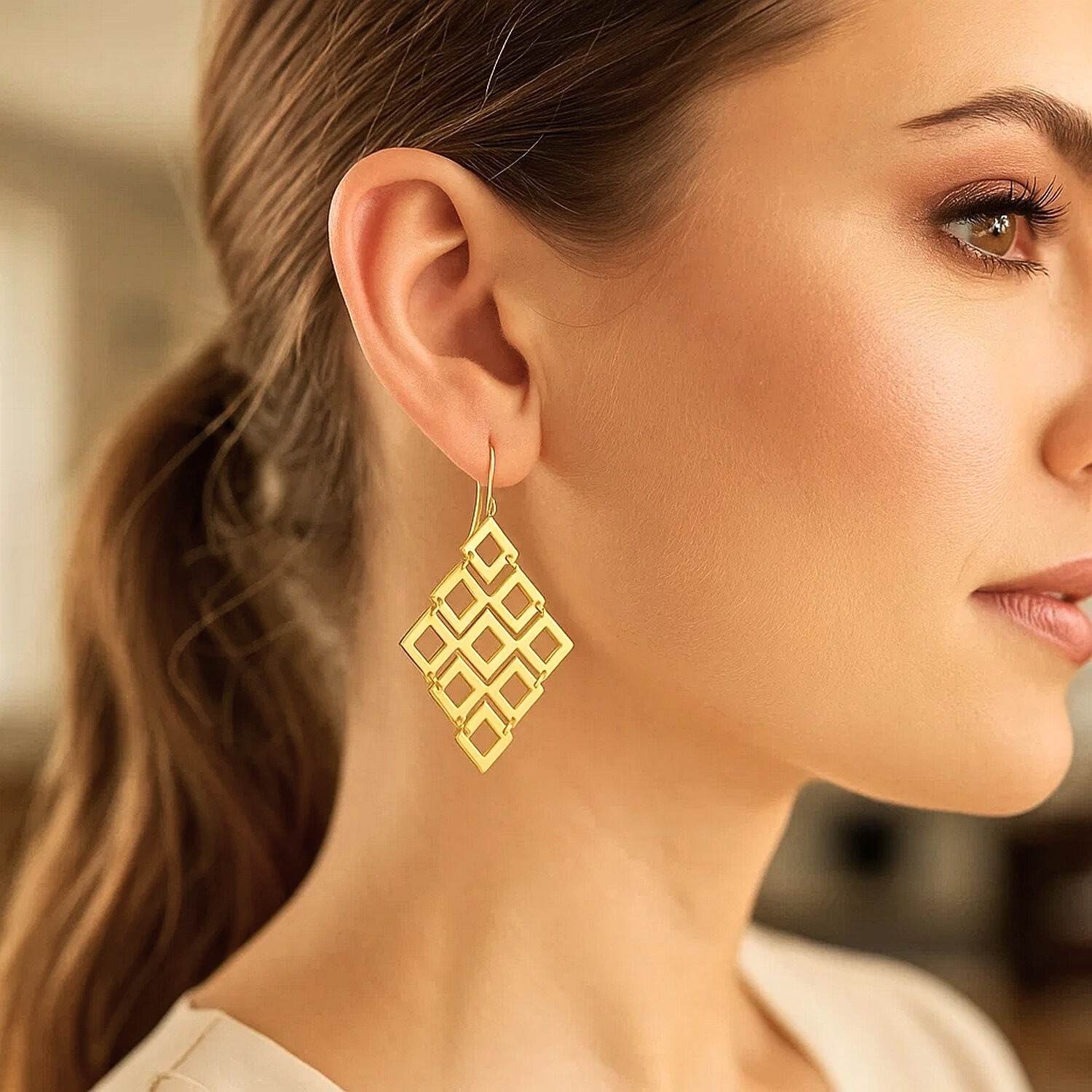 Real 14K Yellow Gold Open Diamond Motif Chandelier Earrings are a special fine jewelry piece that combines elegance and symbolic meaning. The open diamond motifs symbolize purity and eternal beauty. A refined detail for everyday wear and a striking accessory for special occasions. Order online now to carry the quality of real gold and the light of original design every day. Don’t miss out on free shipping and special discount opportunities. them to your collection today and enjoy the perfect blend of style and sophistication.