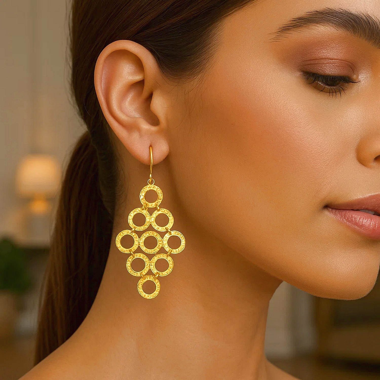 Crafted from genuine 14K yellow gold, these elegant dangle earrings feature a textured open-circle design for a modern look. The polished surface elegantly reflects light, while the delicate sway of the hoops catches the eye with every movement. Thanks to their solid gold construction, they won’t tarnish, are nickel-free, and hypoallergenic. They add understated elegance to everyday wear and dazzling sophistication to special occasions.