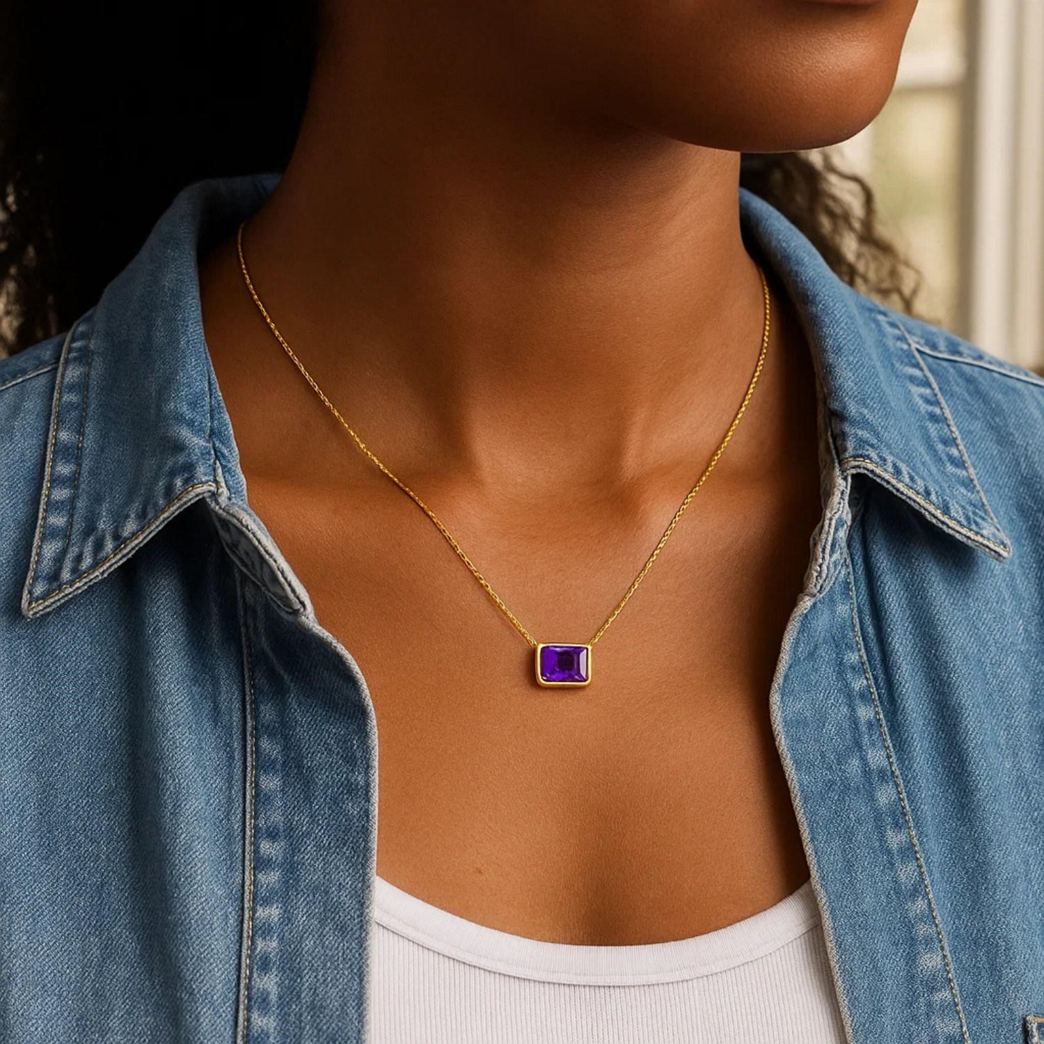 The vibrant purple tone of the emerald cut amethyst stone creates an elegant color accent in women’s both everyday and special outfits. While offering a powerful elegance on its own, it creates a modern look when combined with layered chains.