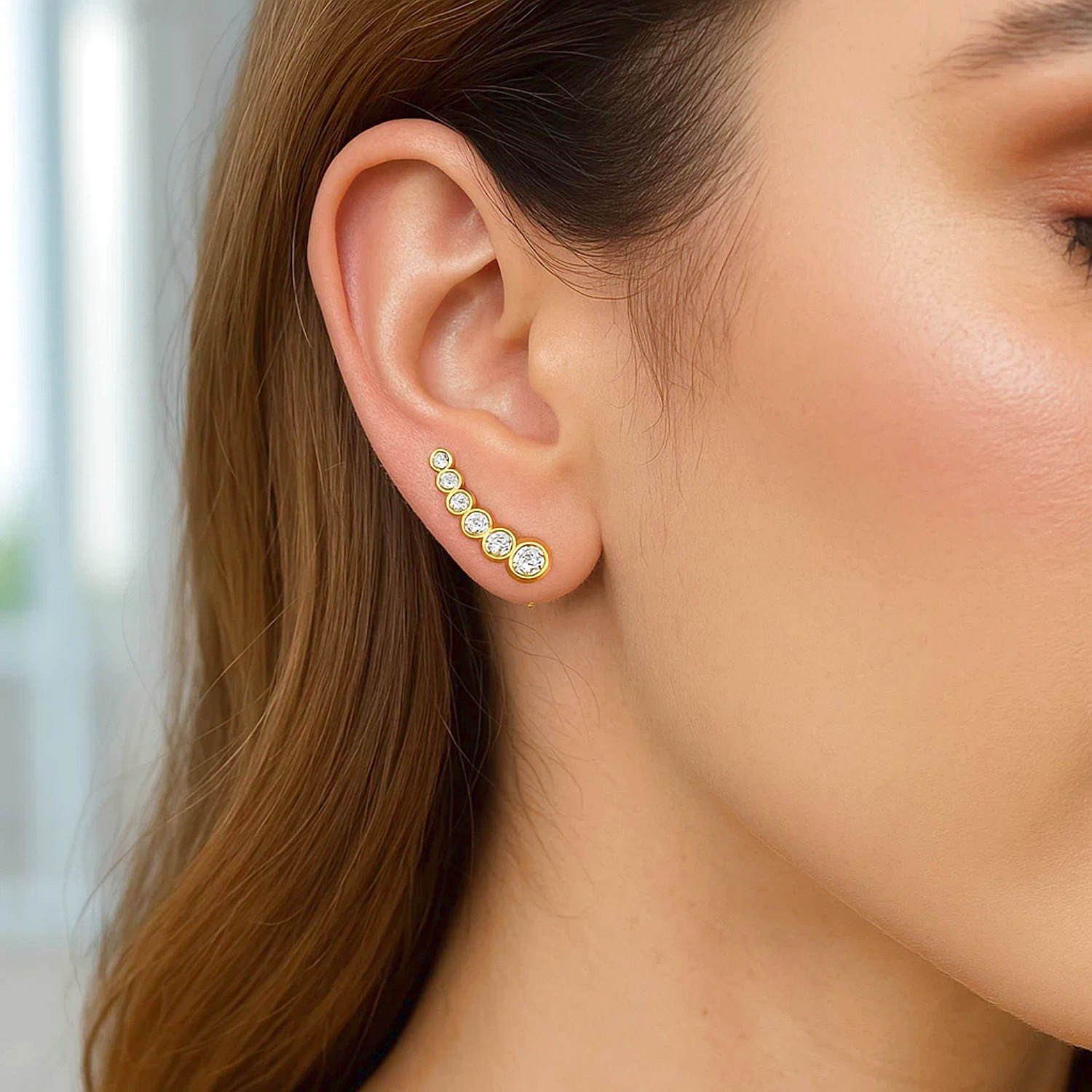 14K Gold Graduated Circles Climber Stud Earrings with Cubic Zirconias offer a modern look that extends upward from the ear with their elegant design. The graduated structure, consisting of six rings, is completed with sparkling cubic zirconia stones on each ring. Thanks to its genuine 14K yellow gold construction, it does not tarnish, is nickel-free, and hypoallergenic. Its polished surface and the sparkle of the stones add an elegant shine even to simple outfits.