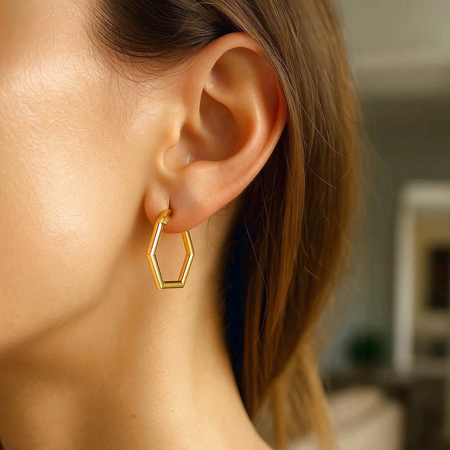 14K Yellow Gold Hexagon Hoop Earrings stand out with their modern design that adds a geometric touch to classic hoop earrings. The hexagonal shape symbolizes elegance and balance, while the polished gold surface reflects light flawlessly. Thanks to their genuine 14K yellow gold construction, they are tarnish-resistant, nickel-free, and hypoallergenic. They offer simple elegance for everyday wear and a dazzling accessory for special occasions.