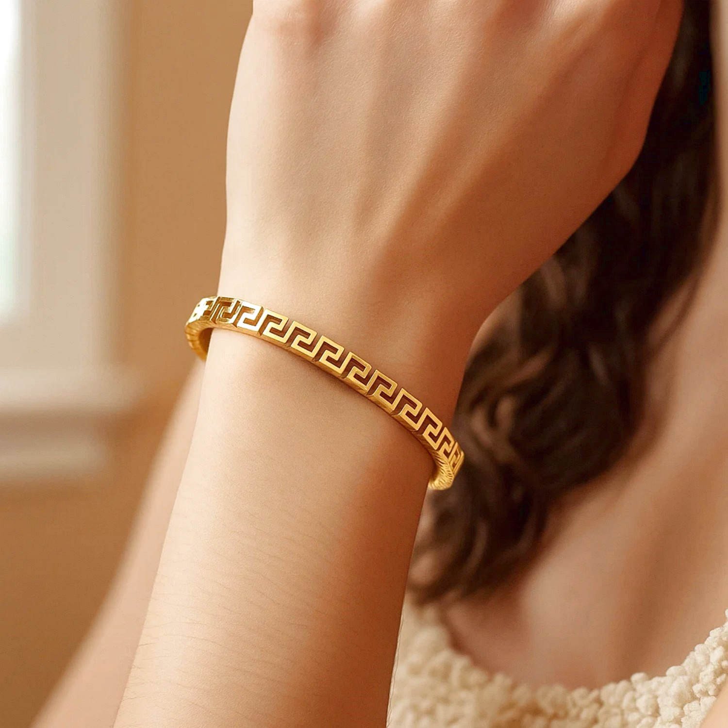 Real 14K Gold Greek Key Bangle Bracelet offers unique elegance and powerful meaning with its classic traditional motifs. Handcrafted, this bracelet is crafted with fine jewelry quality. Its high-gloss surface highlights the luster of 14K gold, while the hypoallergenic and tarnish-resistant properties of gold ensure long-lasting wear. The carved Greek Key pattern symbolizes strength, unity, and eternity, while the 5 mm width creates a balanced and elegant look on the wrist. Suitable for everyday wear, it also complements your style on special occasions.