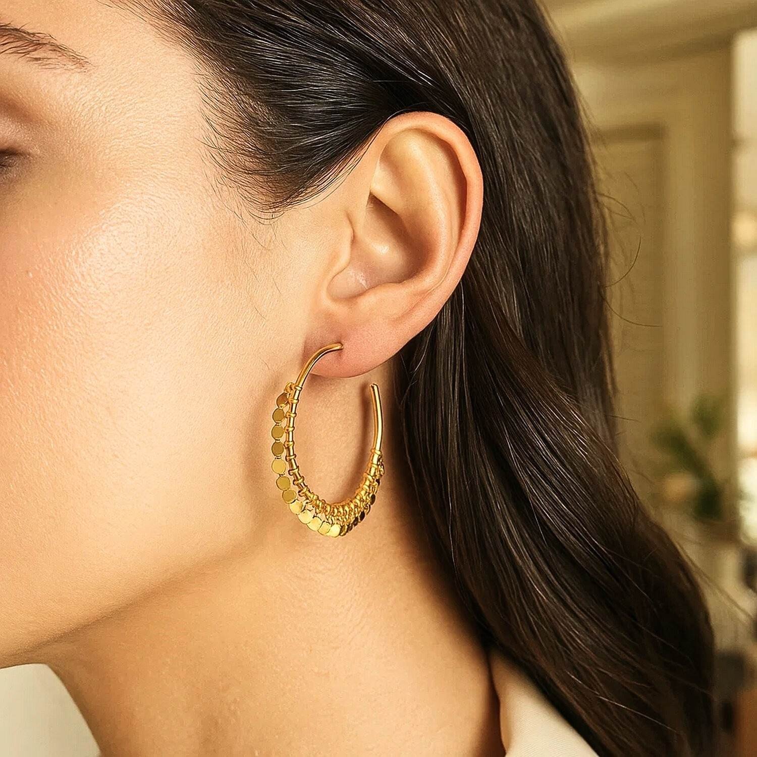 14K Yellow Gold Dangling Sequins Hoop Earrings feature a sophisticated design crafted with fine jewelry workmanship, adding movement and sparkle to the classic hoop shape. Crafted from genuine 14K yellow gold, these earrings feature dangling sequins that reflect light from every angle, creating a dazzling sparkle. Thanks to their genuine gold construction, they do not tarnish, are nickel-free, and retain their original shine for years to come. Designed for women, this model is an impressive accessory for both everyday wear and special occasions.