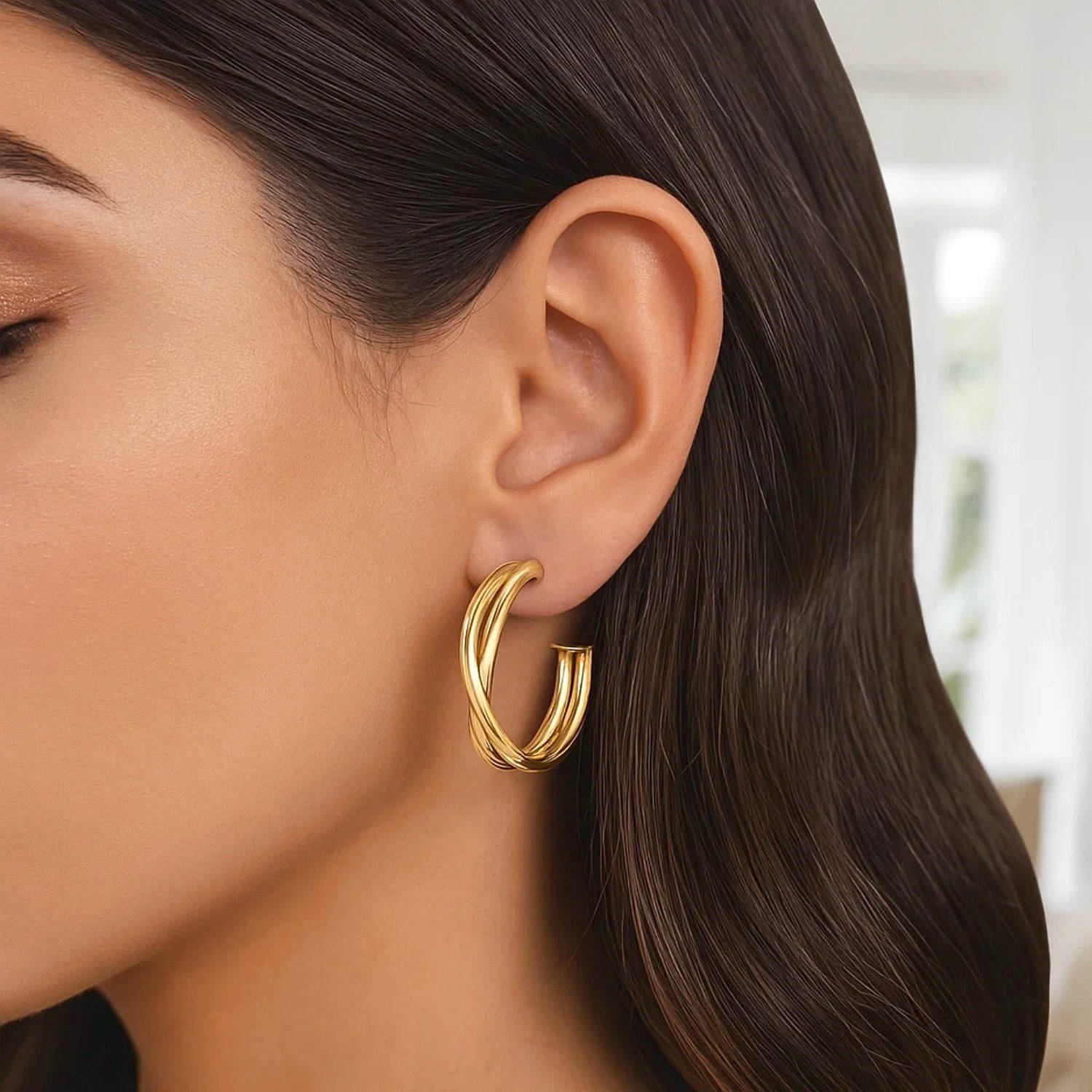 The 14K Yellow Gold Large 23mm Crossover Hoop Earrings offer a striking look by giving the classic hoop design a modern crossover shape. With their polished surface, they reflect light beautifully and complement any style with their elegant lines. Made from genuine 14K yellow gold, it is tarnish-resistant, nickel-free, and hypoallergenic. It can be worn with confidence for everyday elegance or special occasions.