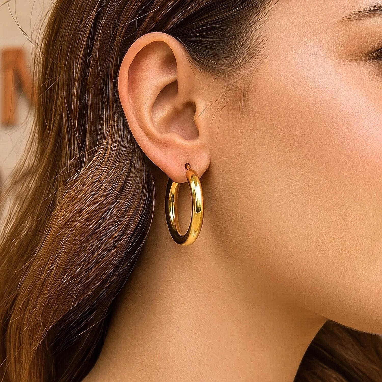 Suitable for both everyday and special occasion outfits, these hoop earrings are the epitome of simple elegance. Thanks to their genuine gold construction, they retain their shine for years and stand out as a timeless piece that appeals to all ages.