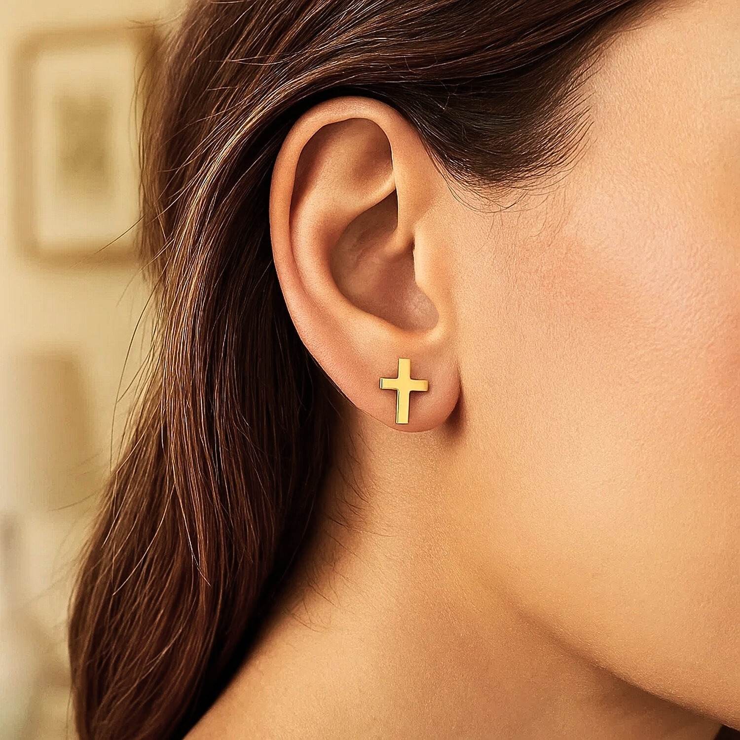 14K Yellow Gold Simple Small Cross Stud Earrings, crafted with fine jewelry workmanship, combine faith and elegance with their delicate cross design. They can be worn as a simple detail with everyday outfits or as a meaningful symbol on special occasions. The genuine 14K yellow gold construction offers long-lasting shine and durability. Its small size ensures it complements any style and maintains an elegant appearance in any setting.