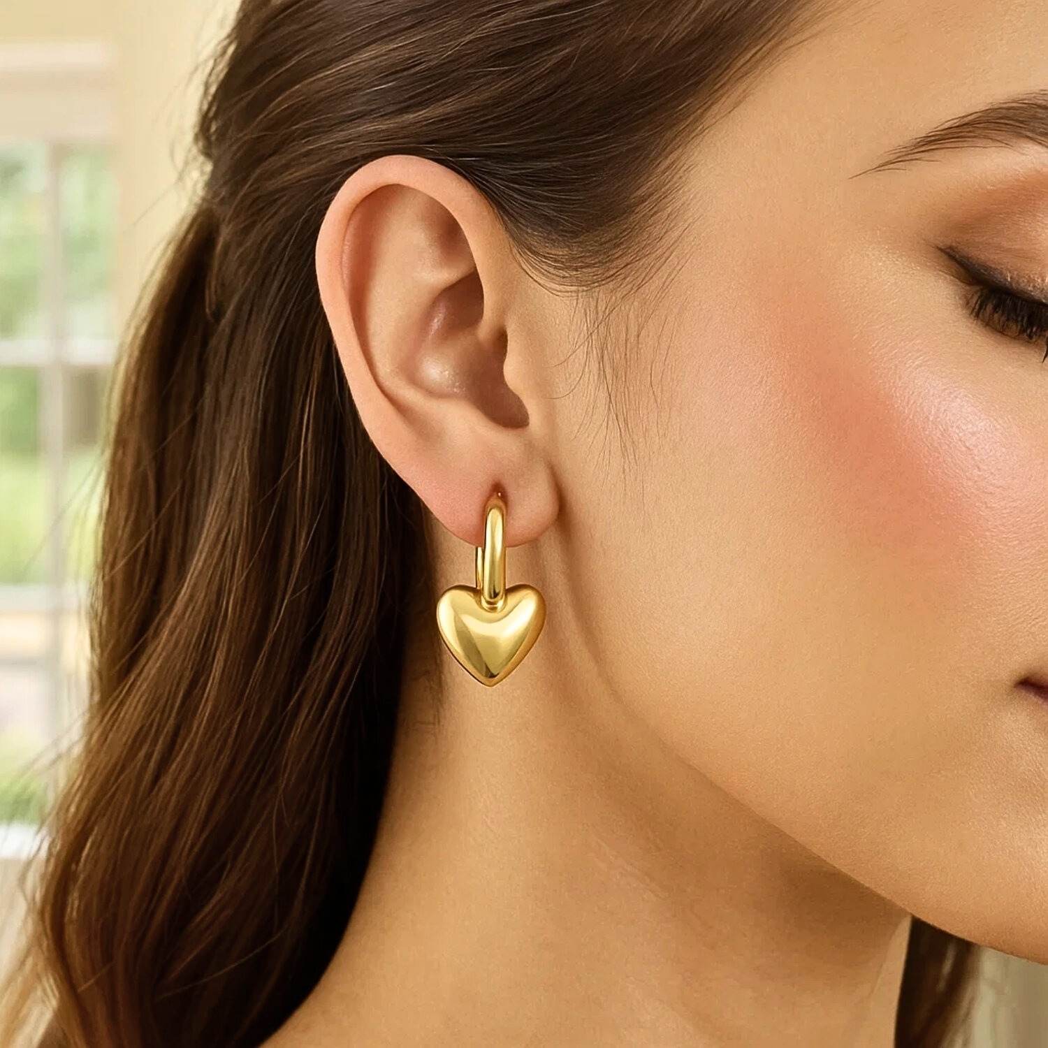 14K Yellow Gold Puffy Heart Drop Huggie Hoop Earrings