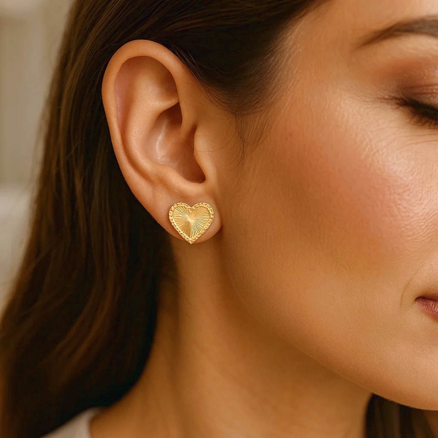 Experience the delicate charm of our 14K yellow solid gold Radiating Heart Stud Earrings. Featuring a beautifully crafted heart design with radiant detailing, these earrings offer a subtle yet sophisticated sparkle. Made from genuine 14K yellow solid gold, they combine quality craftsmanship with everyday comfort. The secure push-back closures ensure they stay comfortably in place, perfect for daily wear or special moments. Add a romantic and refined touch to your jewelry collection with these captivating studs.