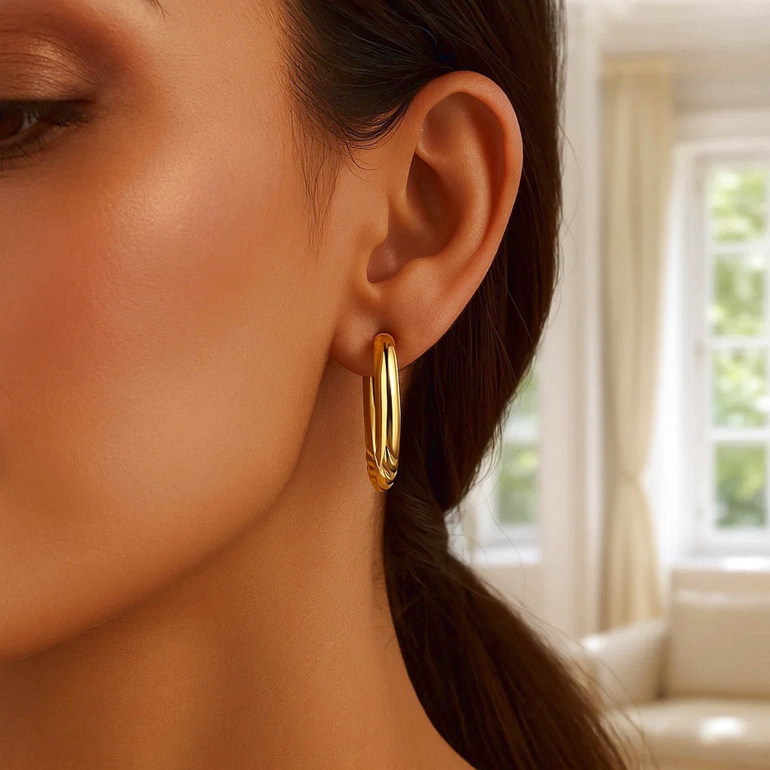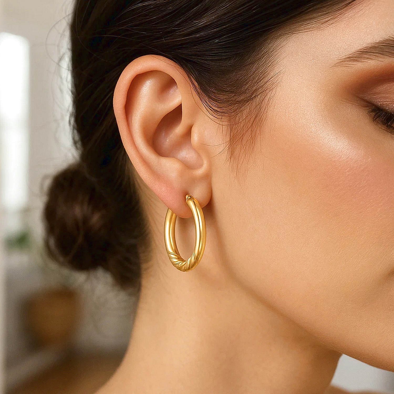 Real 14K Yellow Gold Medium size Twist Textured Hoop Earrings give classic hoop earrings a modern look with their partially twisted design. Their polished surface beautifully reflects light, creating a simple yet eye-catching look. Made from genuine 14K yellow gold, they are tarnish-resistant, nickel-free, and hypoallergenic. Suitable for everyday wear, they also make a stylish accessory for special occasions.
