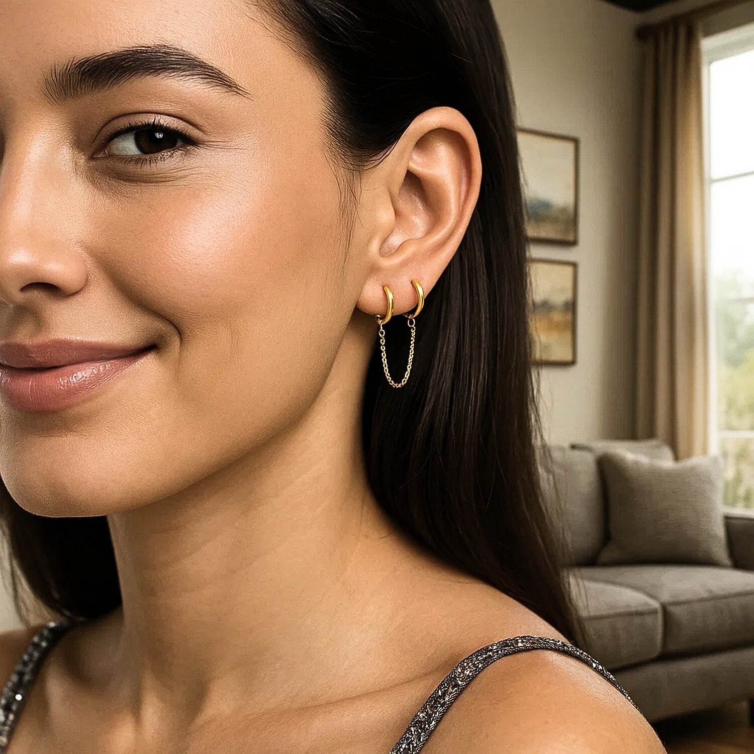 14K Yellow Gold Two Hole Chain Huggie Hoop Earrings combine classic elegance with a modern design. Crafted from genuine 14K yellow gold, this unique model features two separate mini hoops connected by a thin chain in the middle. Designed for women, these boho-style earrings create an elegant whole when worn in both ear piercings, reflecting light with every movement for a dazzling shine.