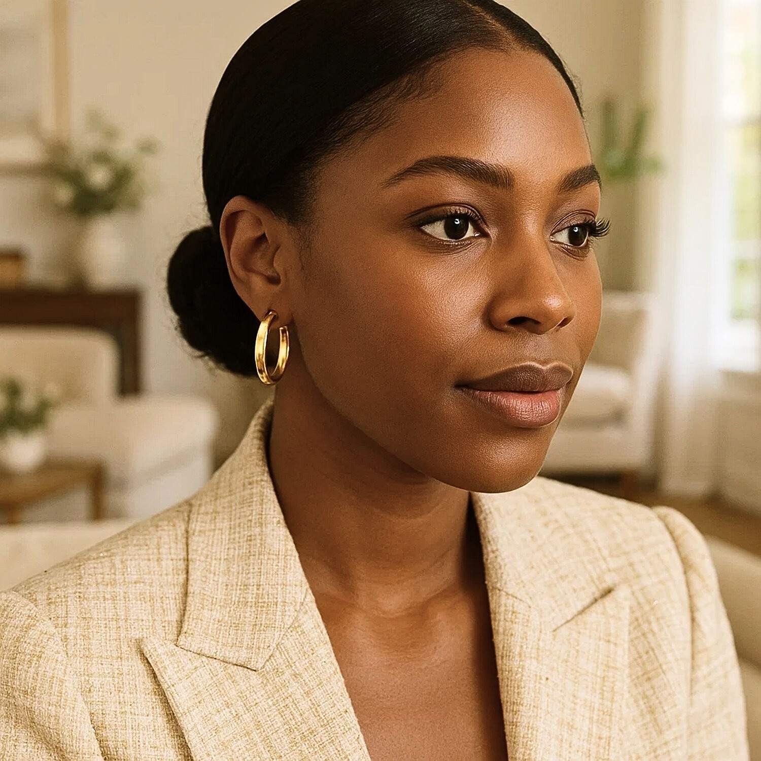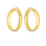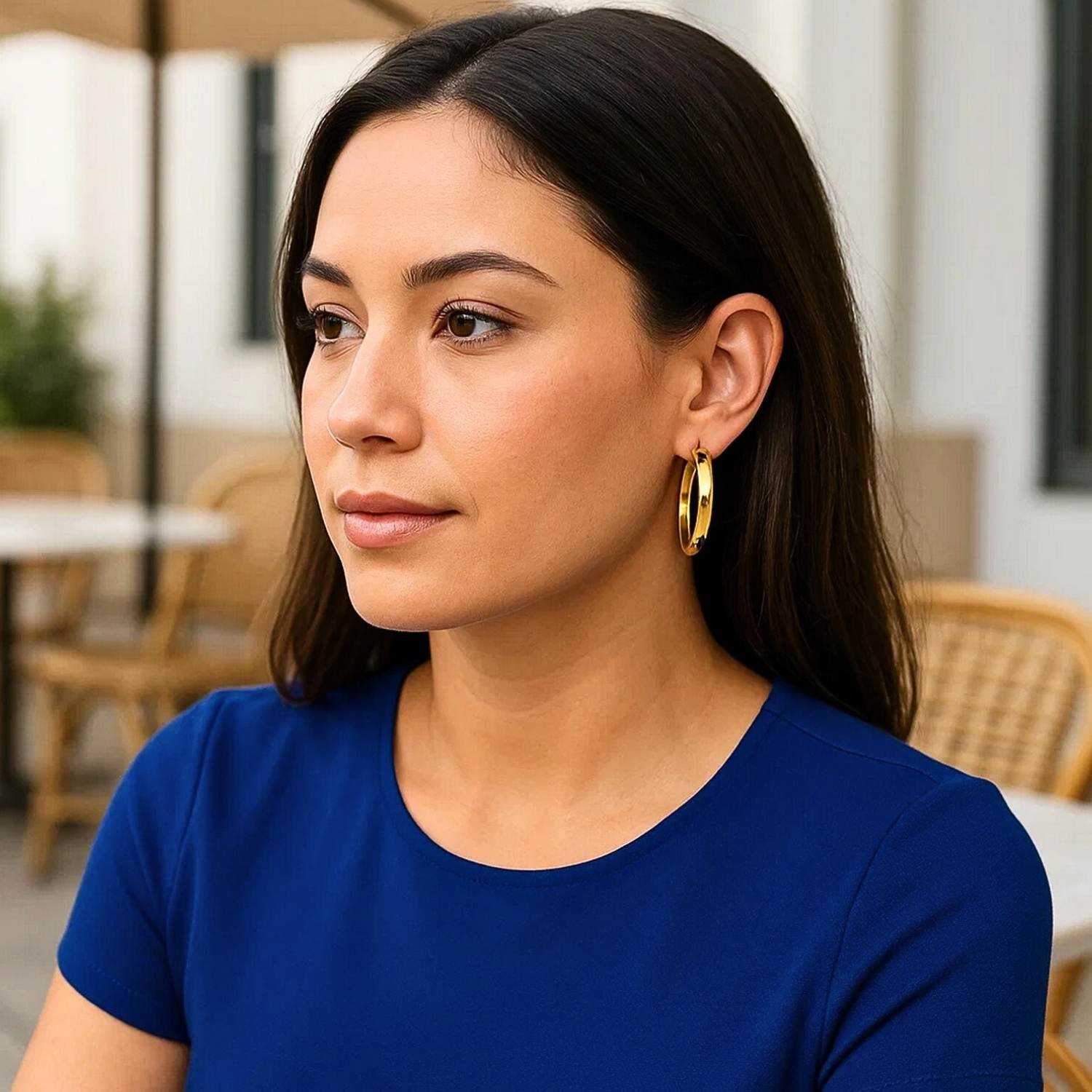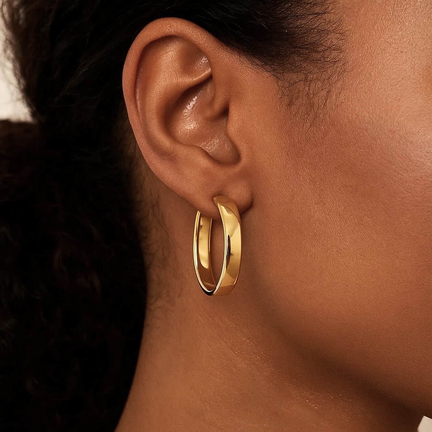 14K Yellow Gold 35mm Wedding Band Hoop Earrings feature a bold design that stands out with its simple form and wide structure. They are crafted from genuine 14K yellow gold and prepared with fine jewelry craftsmanship quality. The wedding band-style surface offers a clean, shiny, and classic look. It does not tarnish, contains no nickel, and is suitable for sensitive skin.