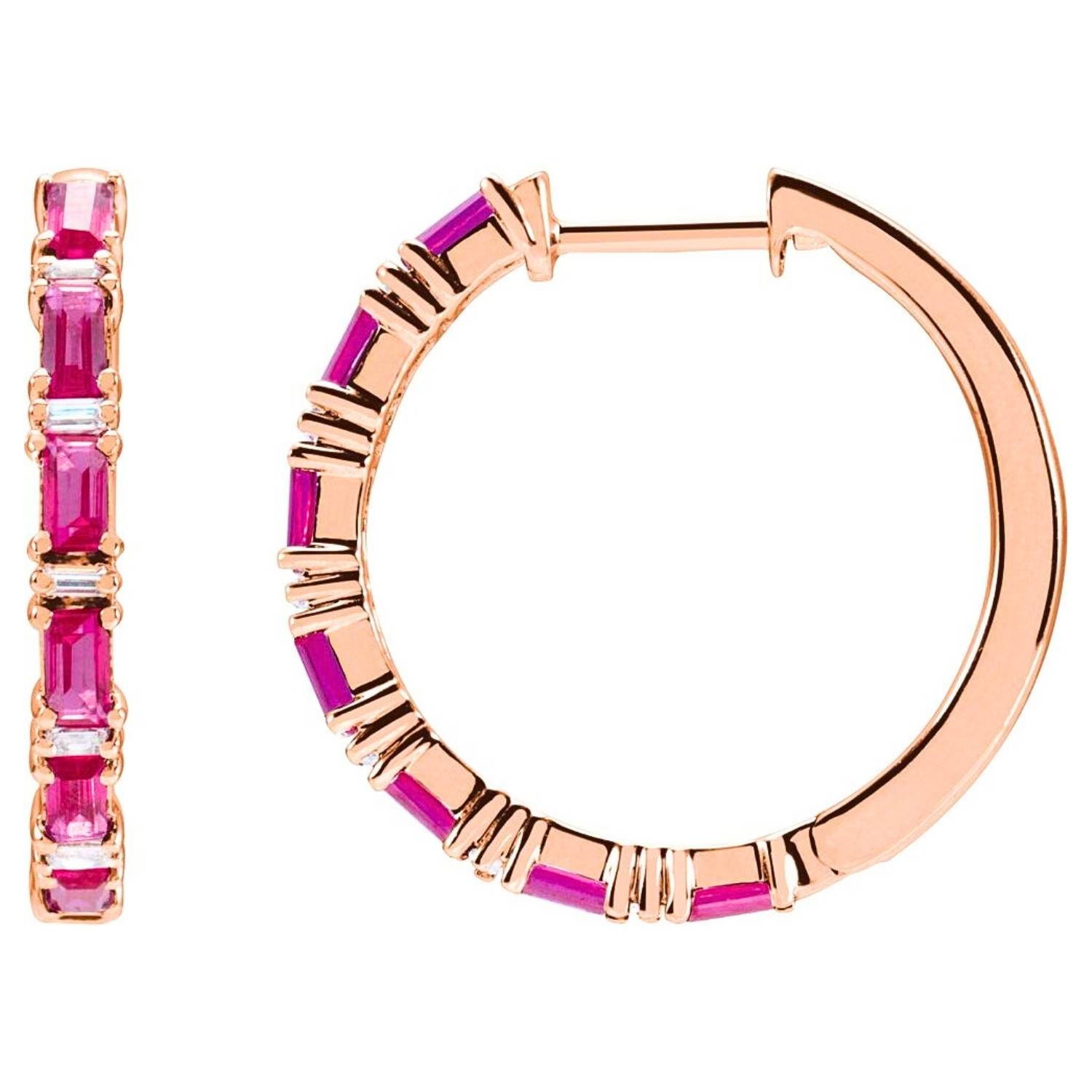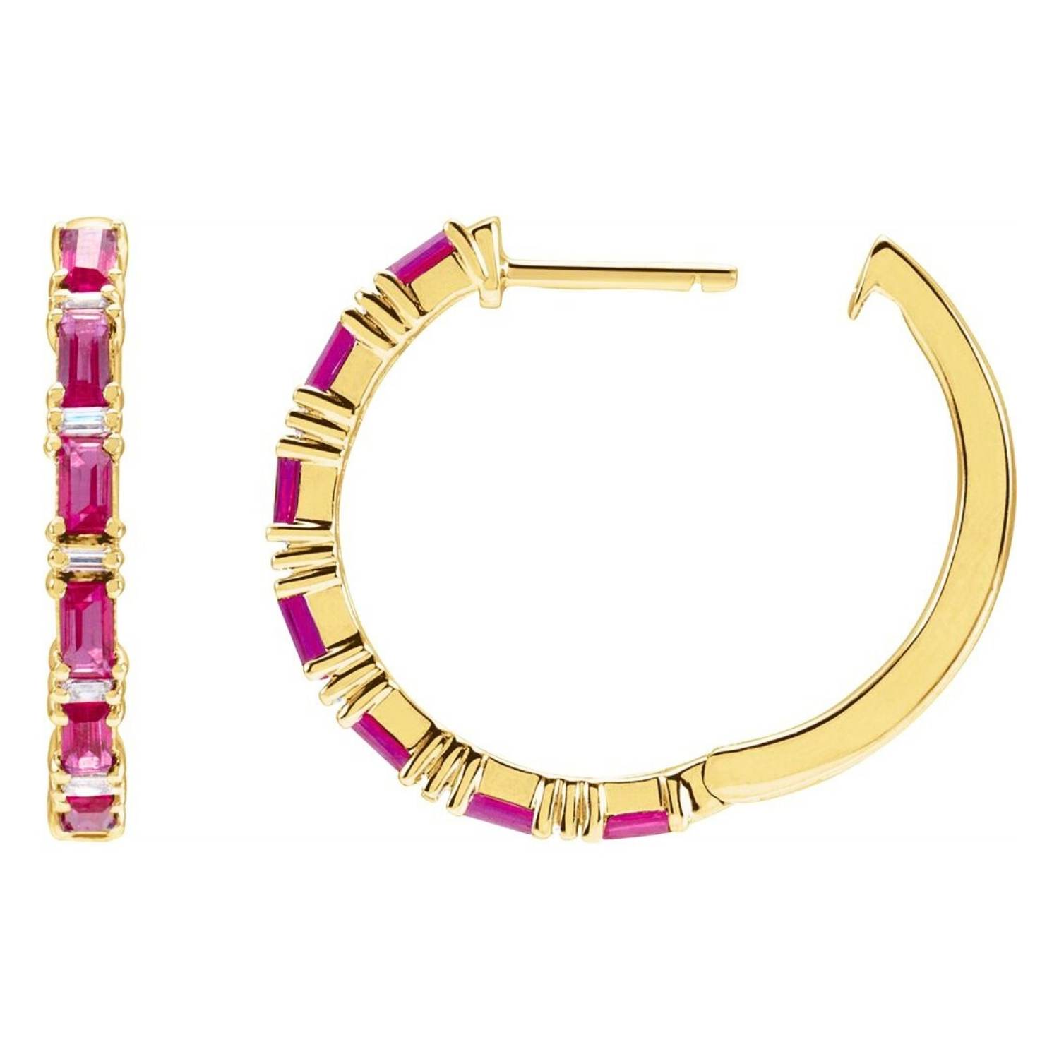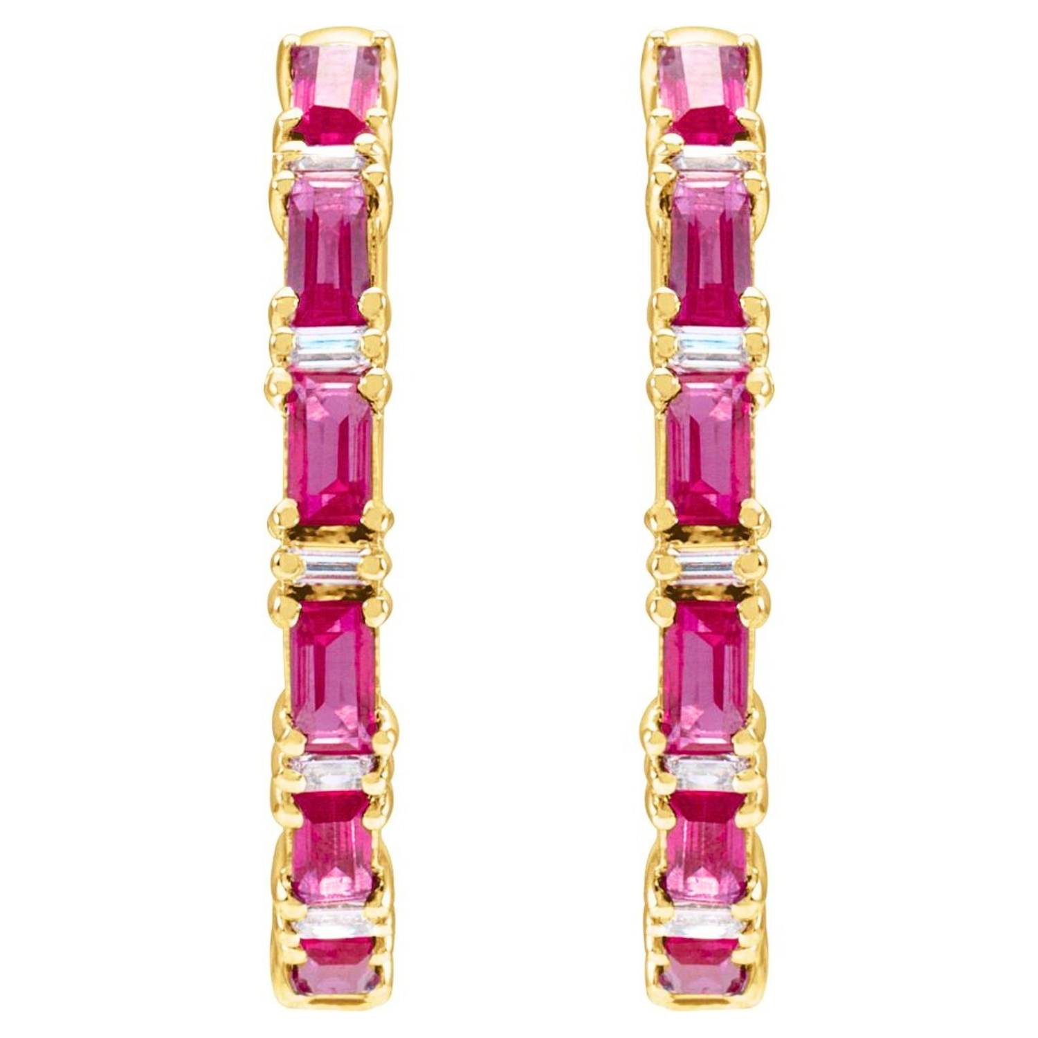 14K Gold Baguette Ruby and Diamond Hoop Earrings offer a simple and elegant design with unique craftsmanship and stone arrangement. Order online now to take advantage of free shipping and special discounts.