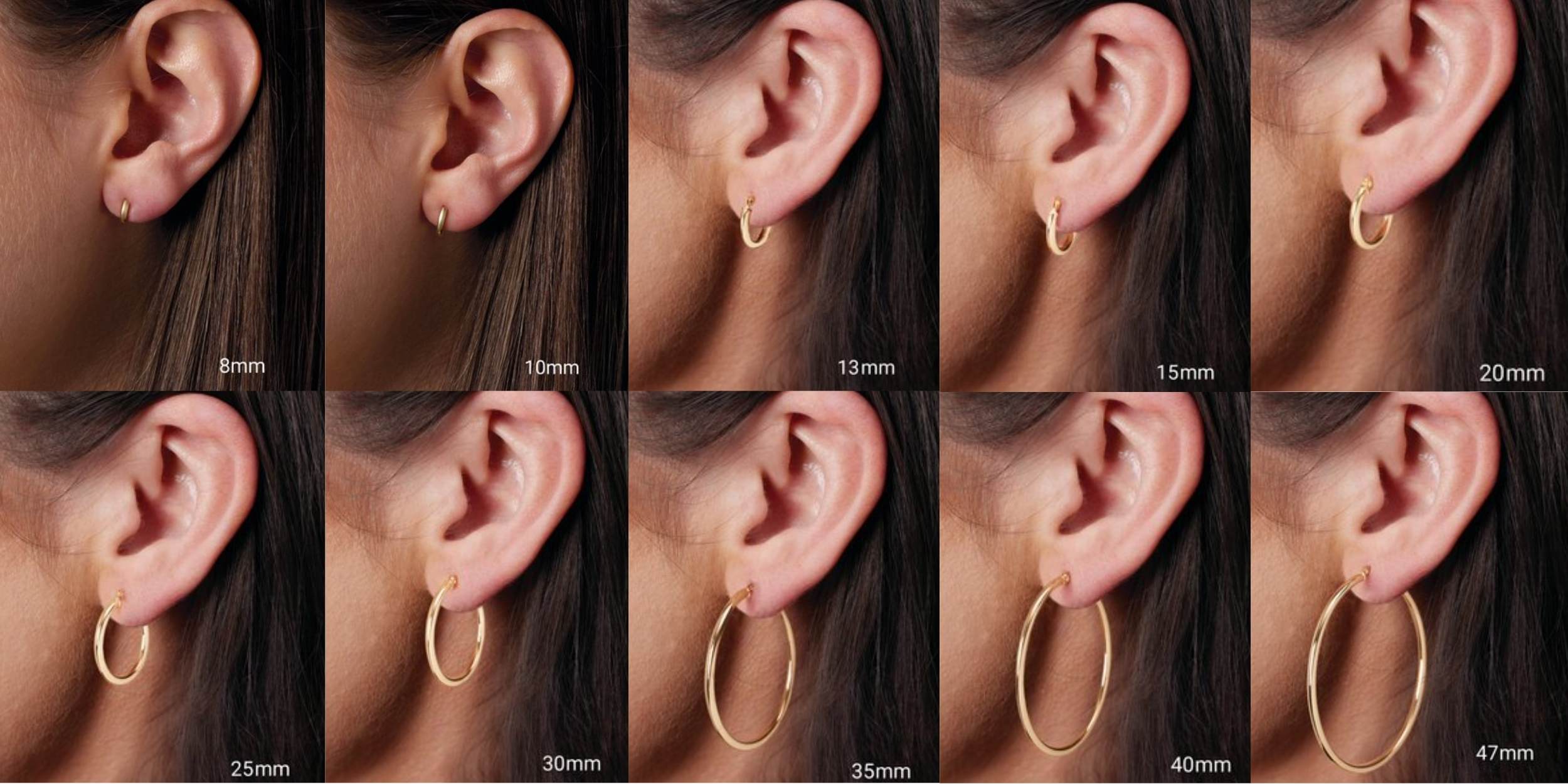 Actual Size 8mm, 10mm, 13mm, 15mm, 20mm, 25mm, 30mm, 35mm, 40mm, 47mm hoop earrings size chart on ear