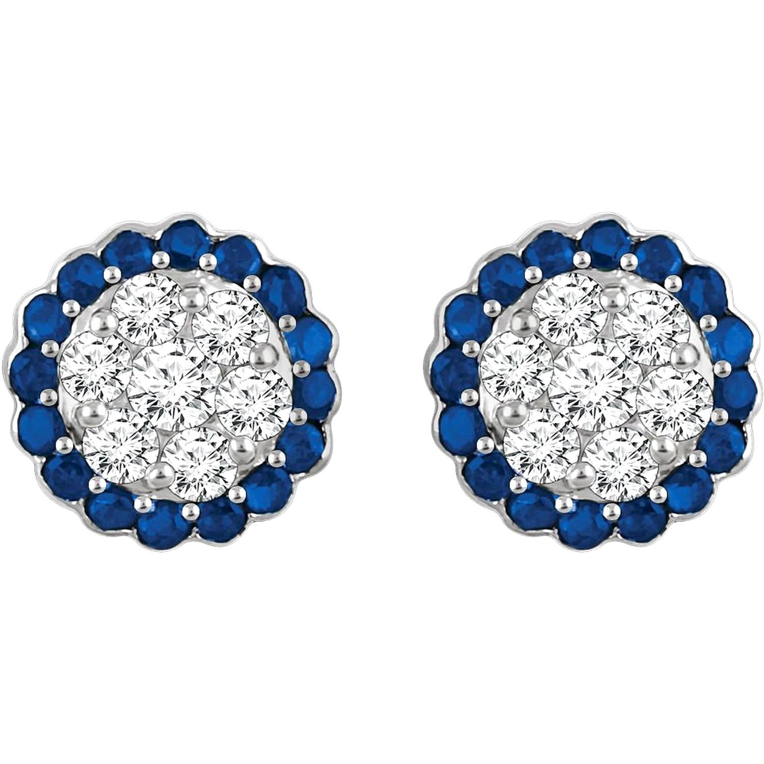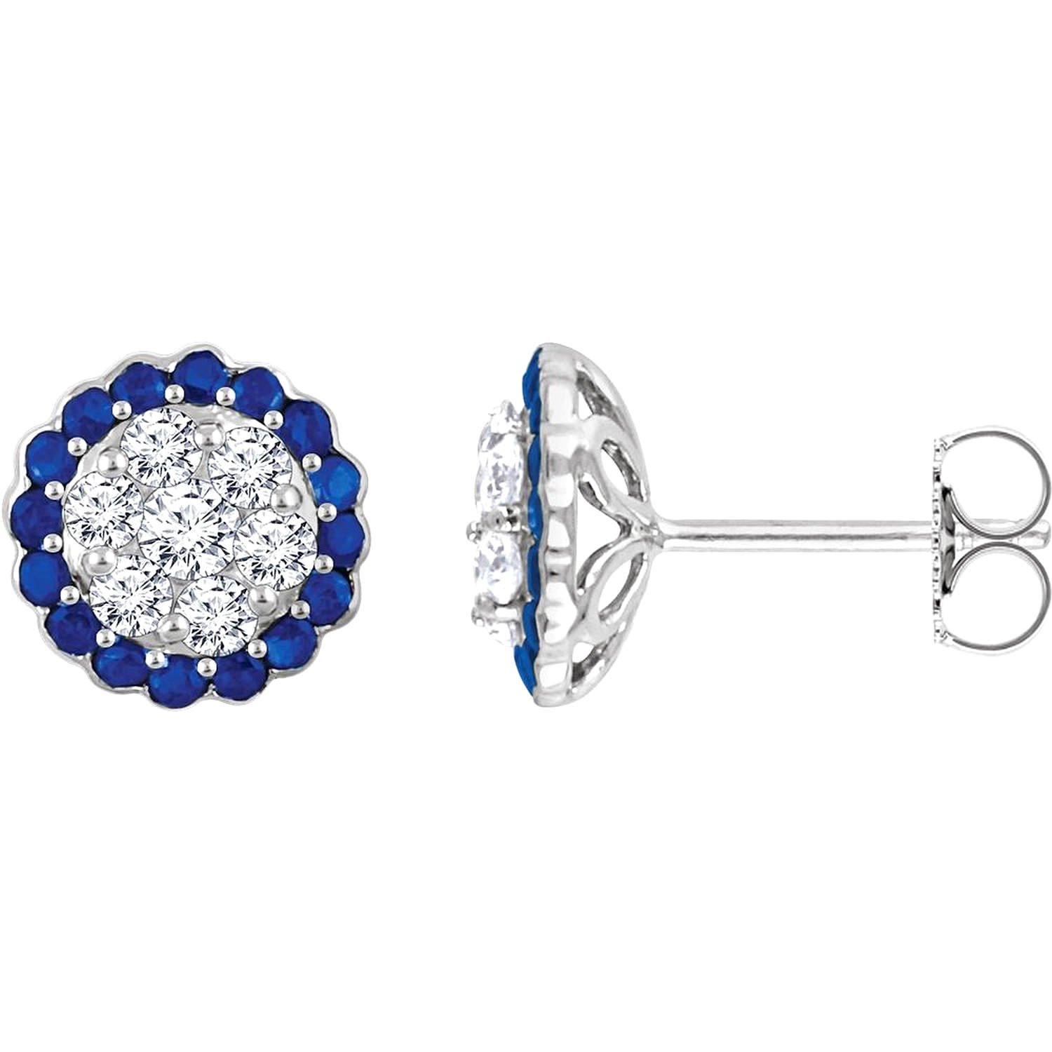 Featuring a dense arrangement of blue sapphires and a diamond halo, these cluster stud earrings offer a balanced choice for everyday and special occasions with their compact form and powerful sparkle. Order online now to take advantage of free shipping and special offers.
