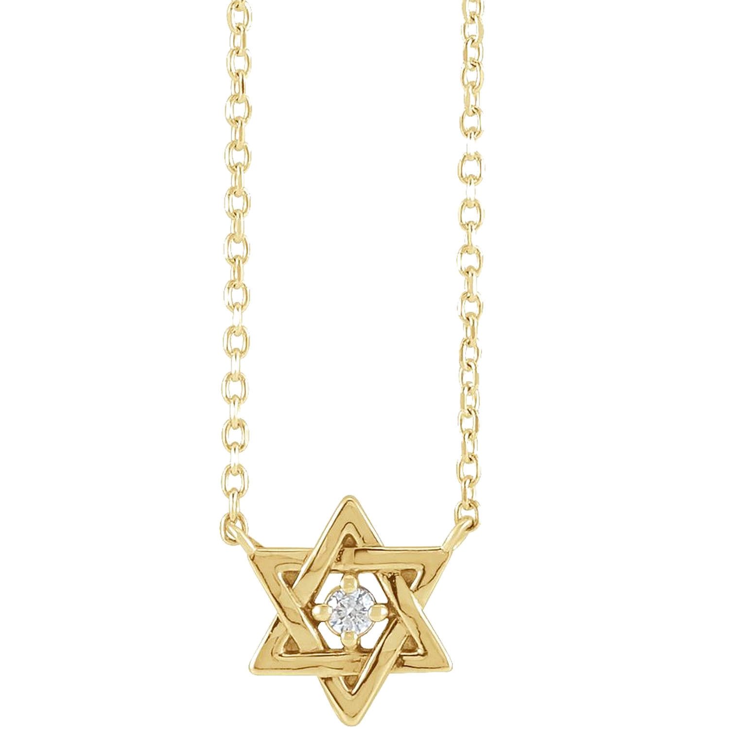 This Dainty Star of David necklace features a clean, refined design accented with a single round natural diamond set at the center of the classic six-pointed star. The petite scale and balanced proportions give the piece a light, wearable presence suitable for everyday wear.