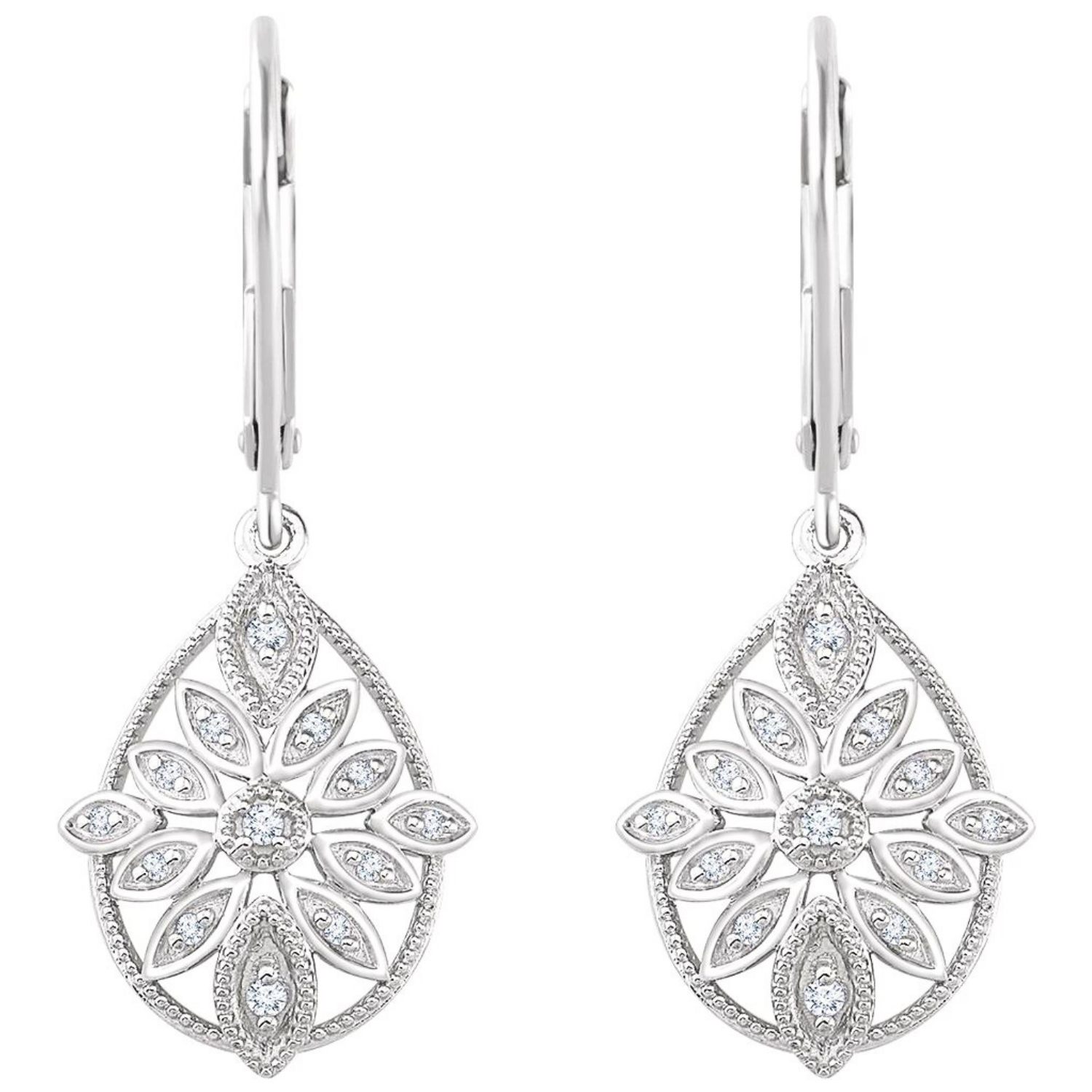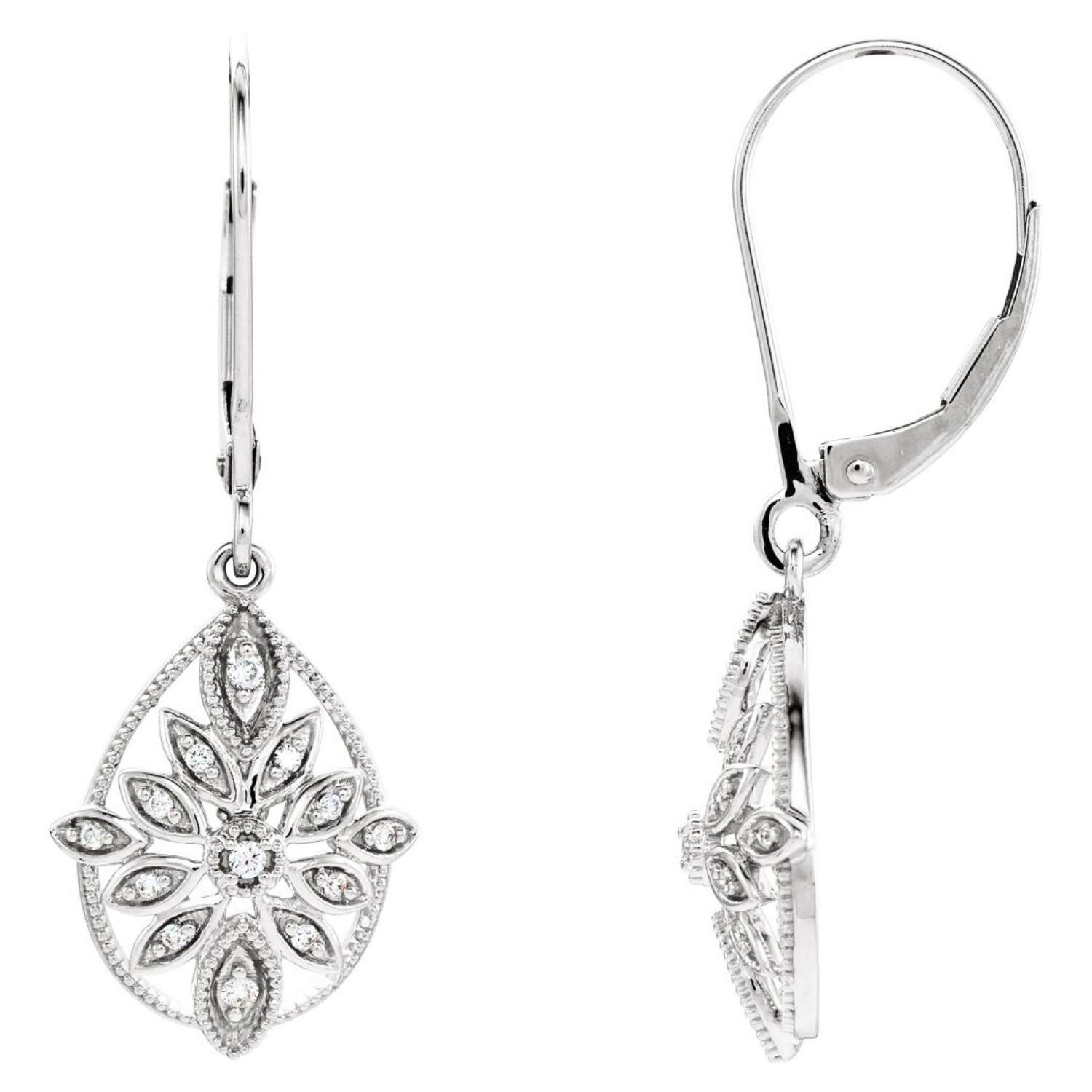 14K White Gold Diamond Floral Filigree Leverback Teardrop Earrings – 1/6 CTW