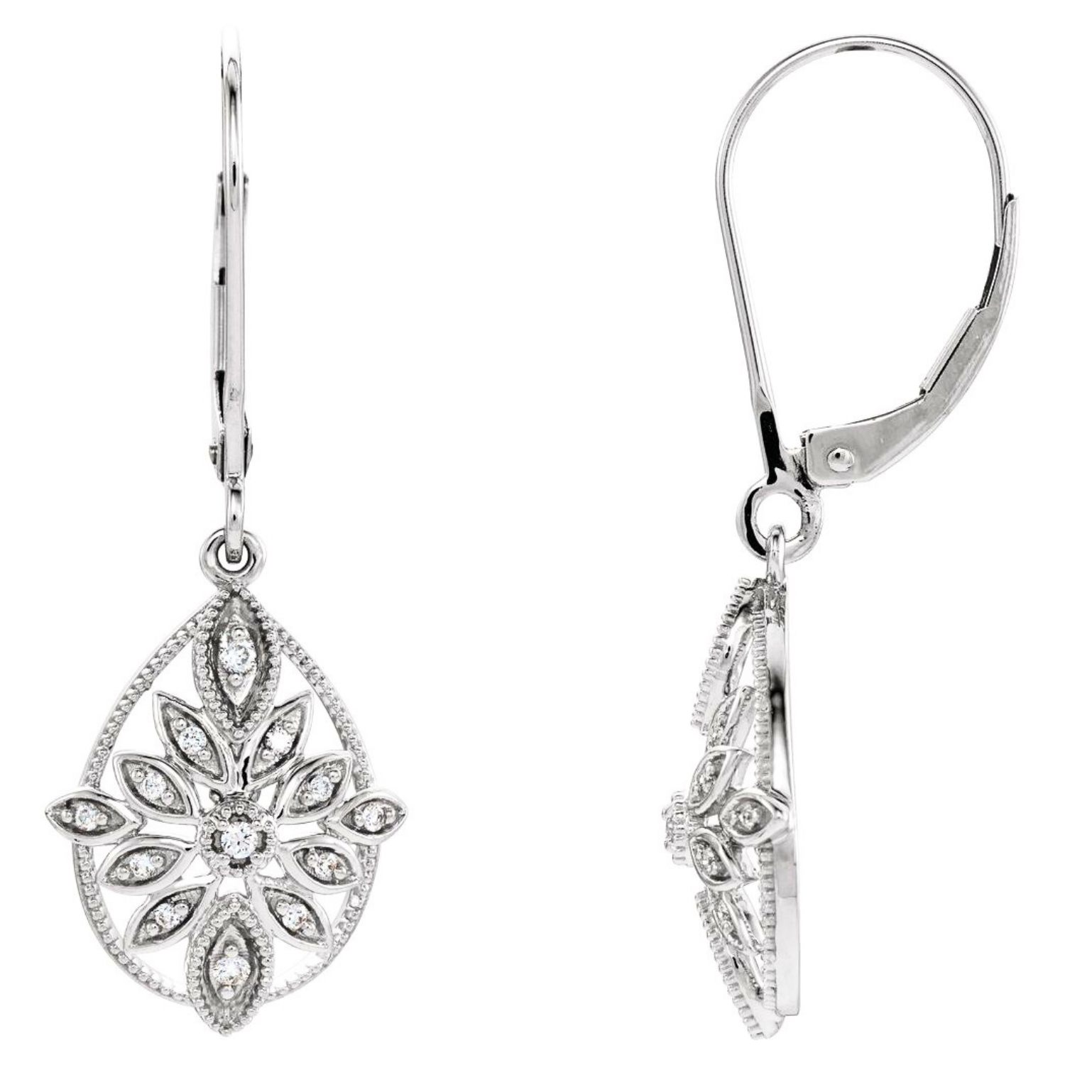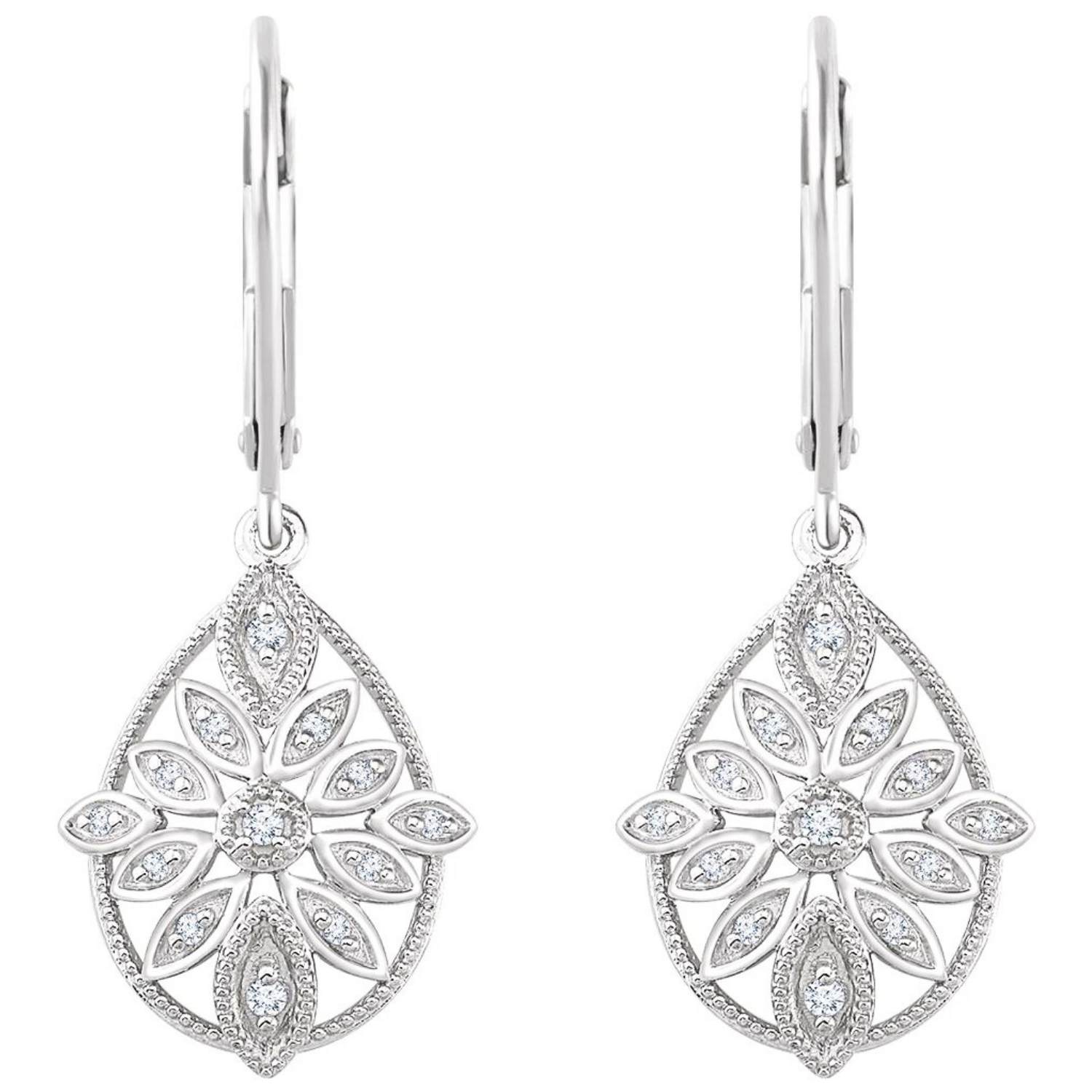 Floral Genuine Diamond Filigree Leverback Teardrop Earrings Sterling Silver 1/6 CT TW