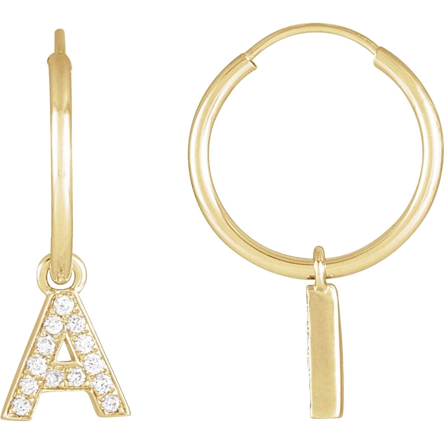 Crafted from solid 14k gold and finished with a polished surface, the hoop is accented with round natural diamonds set into the initial charm. The hinged closure provides secure and comfortable wear, making this piece ideal for styling alone or mixing with other earrings.