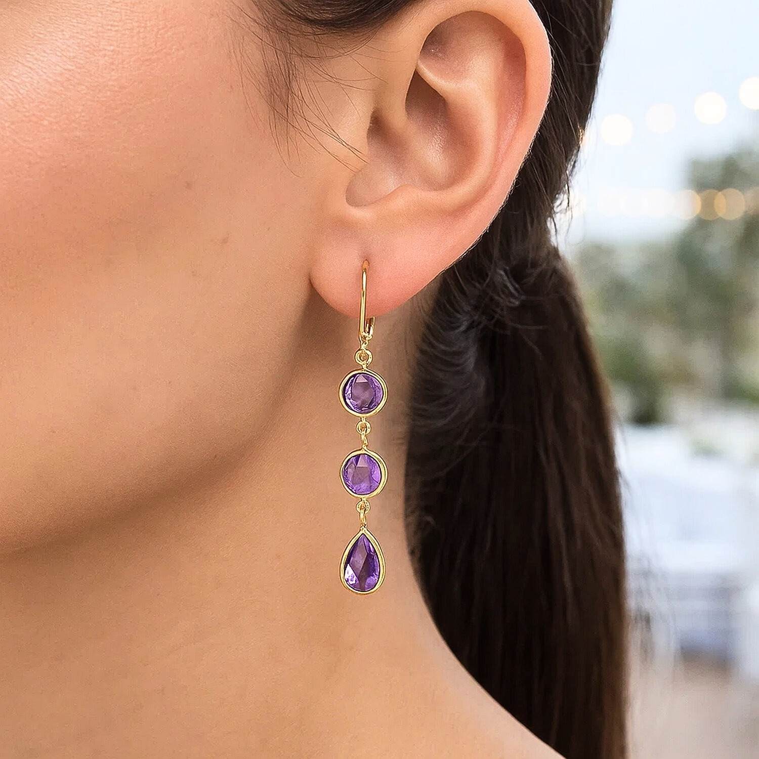 3 Stone Amethyst Drop Dangle Earrings 14k Gold
