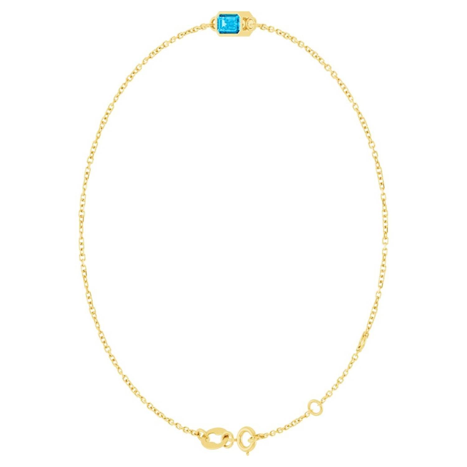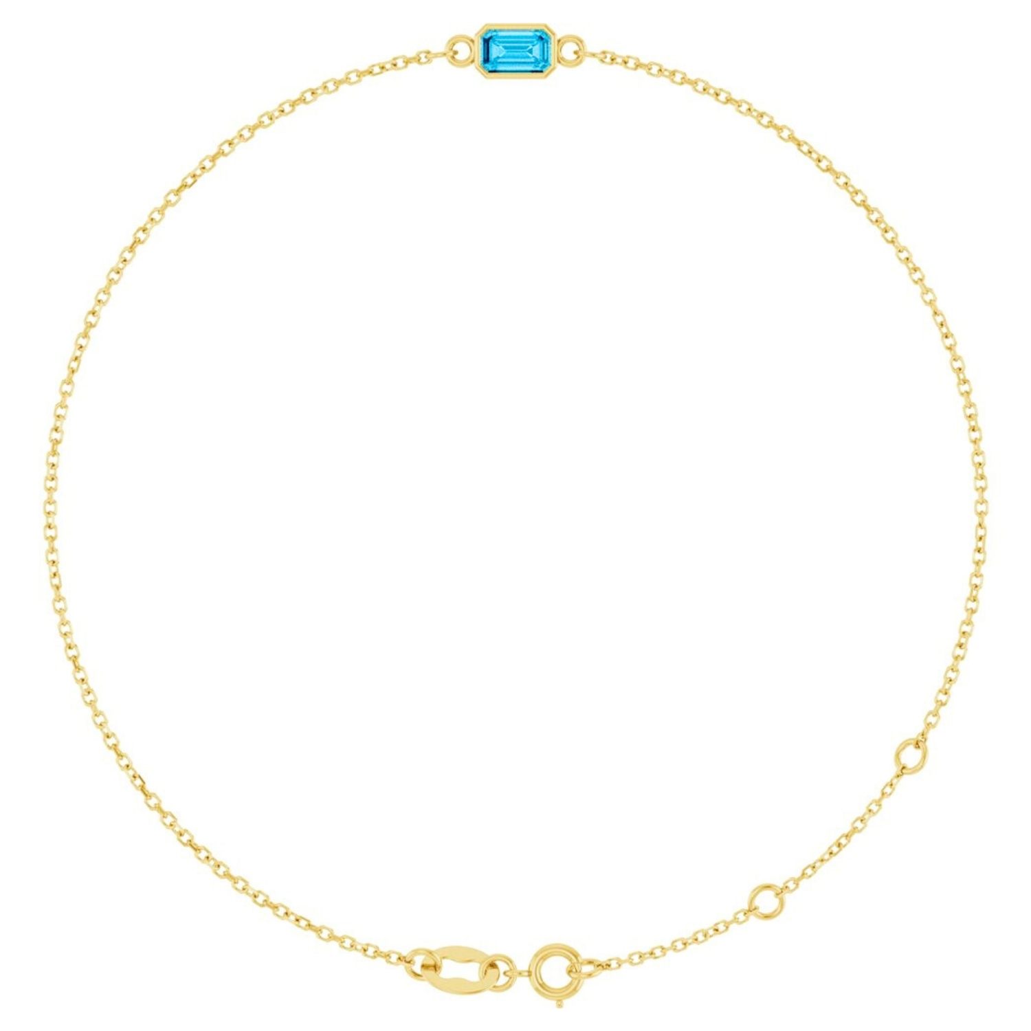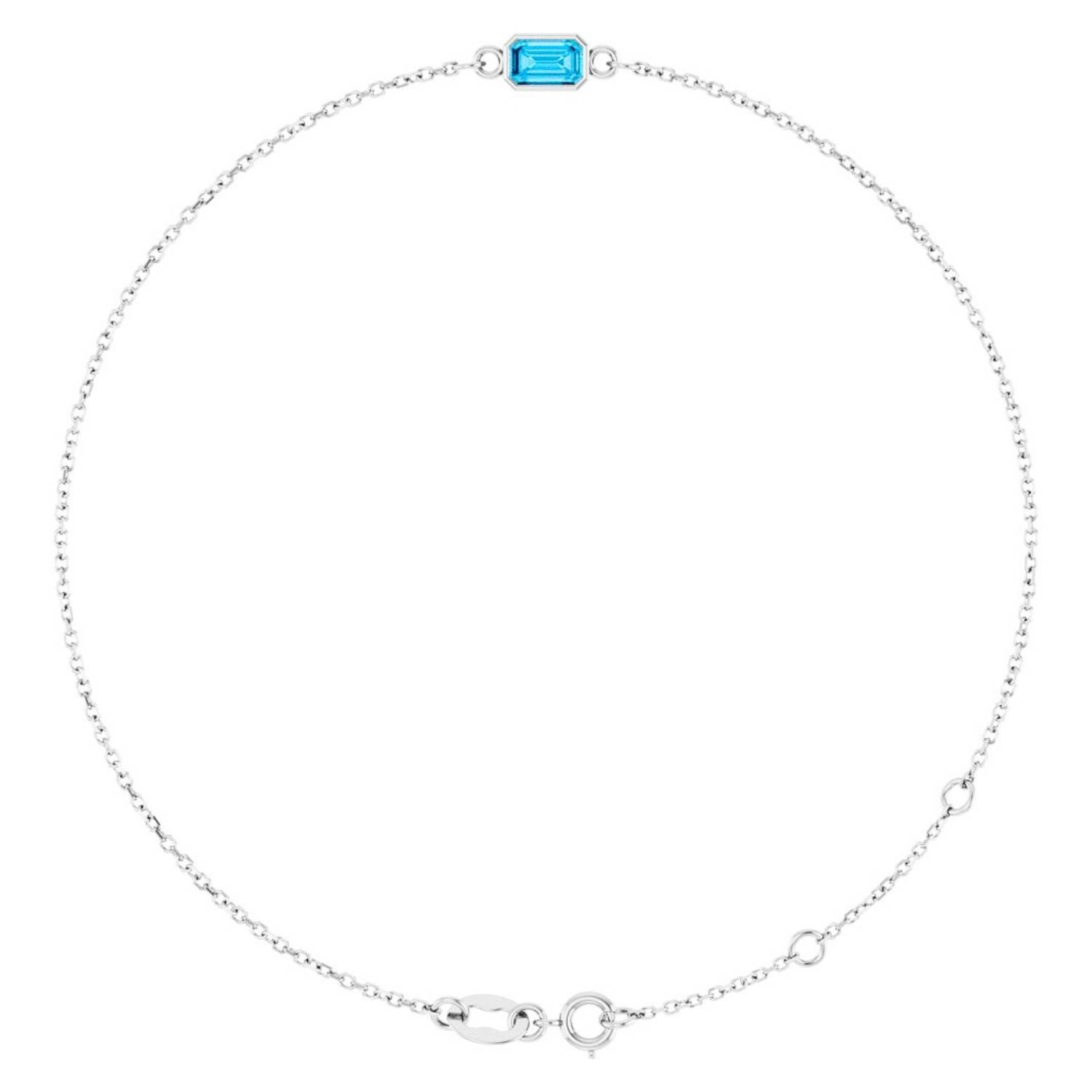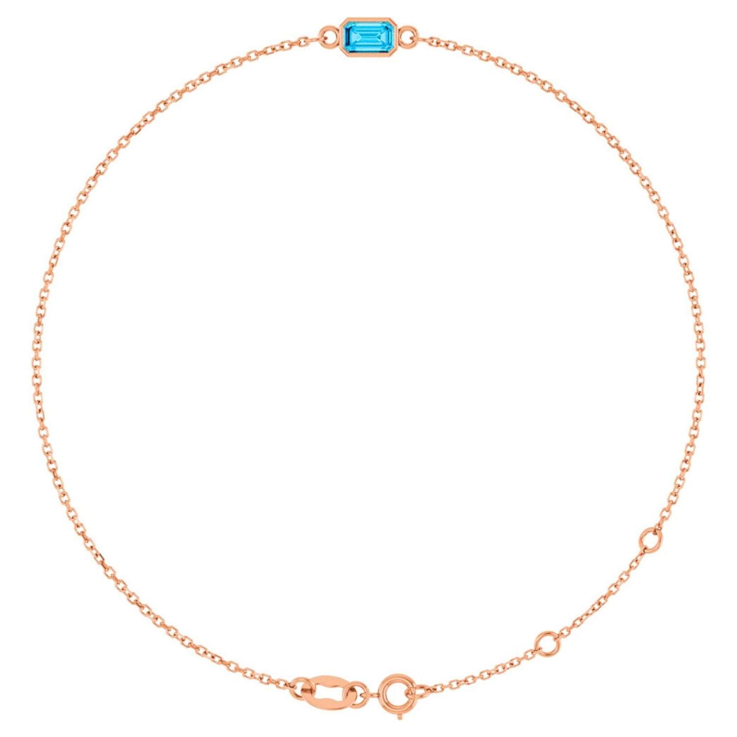 Solid 14k gold genuine aquamarine bracelet, captivating with its natural beauty. The emerald cut aquamarine stone brings the serenity of water to your wrist with its clear blue hue. The delicate link chain design and bezel setting detail combine modern elegance with a classic touch. It is an elegant detail for everyday wear and a dazzling accessory for special occasions.