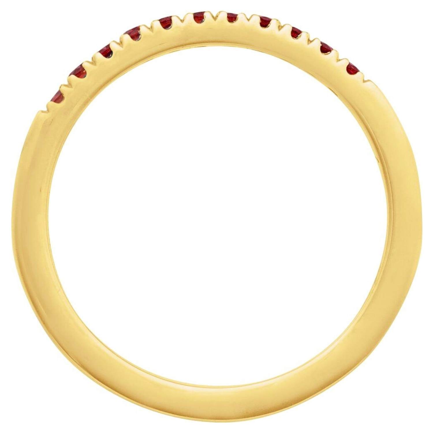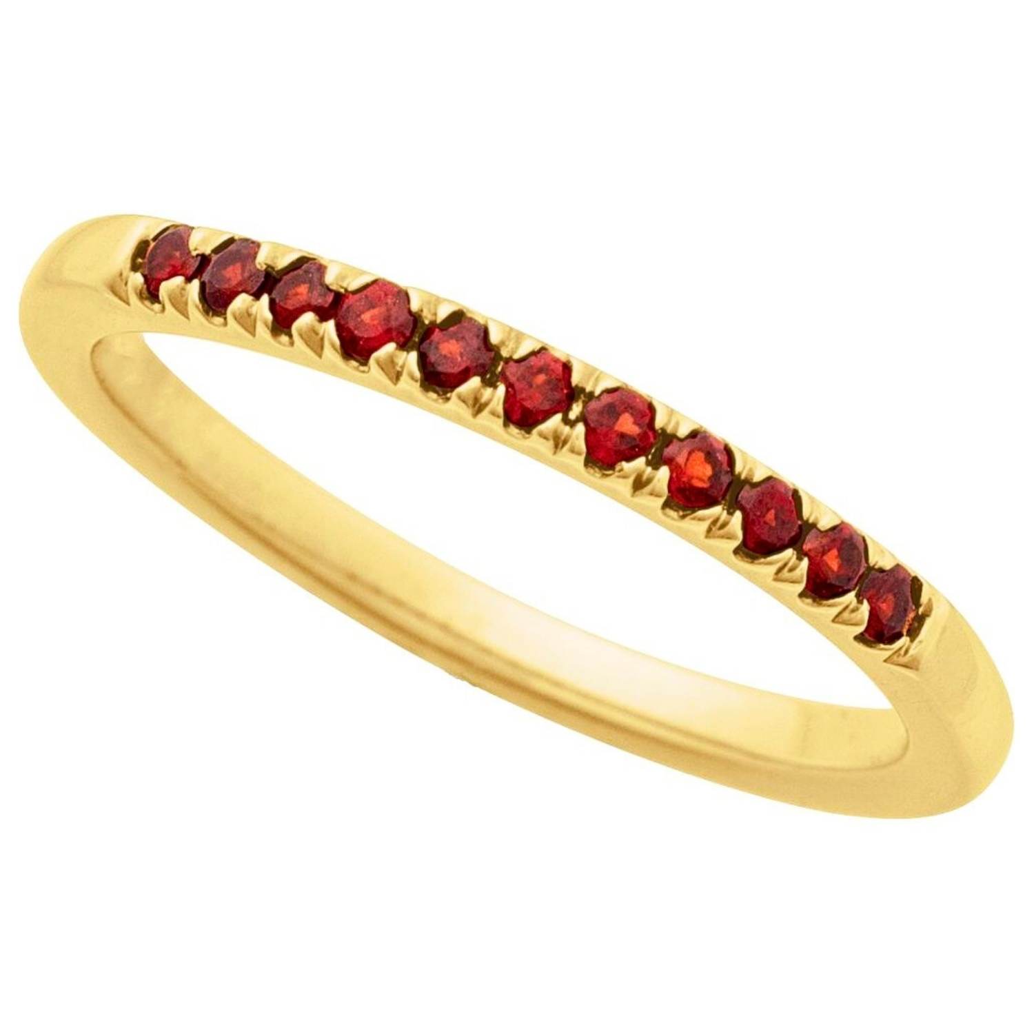 The 14K Gold Garnet January Birthstone Stackable Ring is an elegant and delicate piece of jewelry for women, suitable for everyday wear, featuring the deep red brilliance of natural garnet stones in a minimalist design. Worn alone, it offers simple elegance, while paired with other rings, it creates a modern layered style. Eleven round-cut natural garnet stones accentuate their vibrant color against the polished gold.
